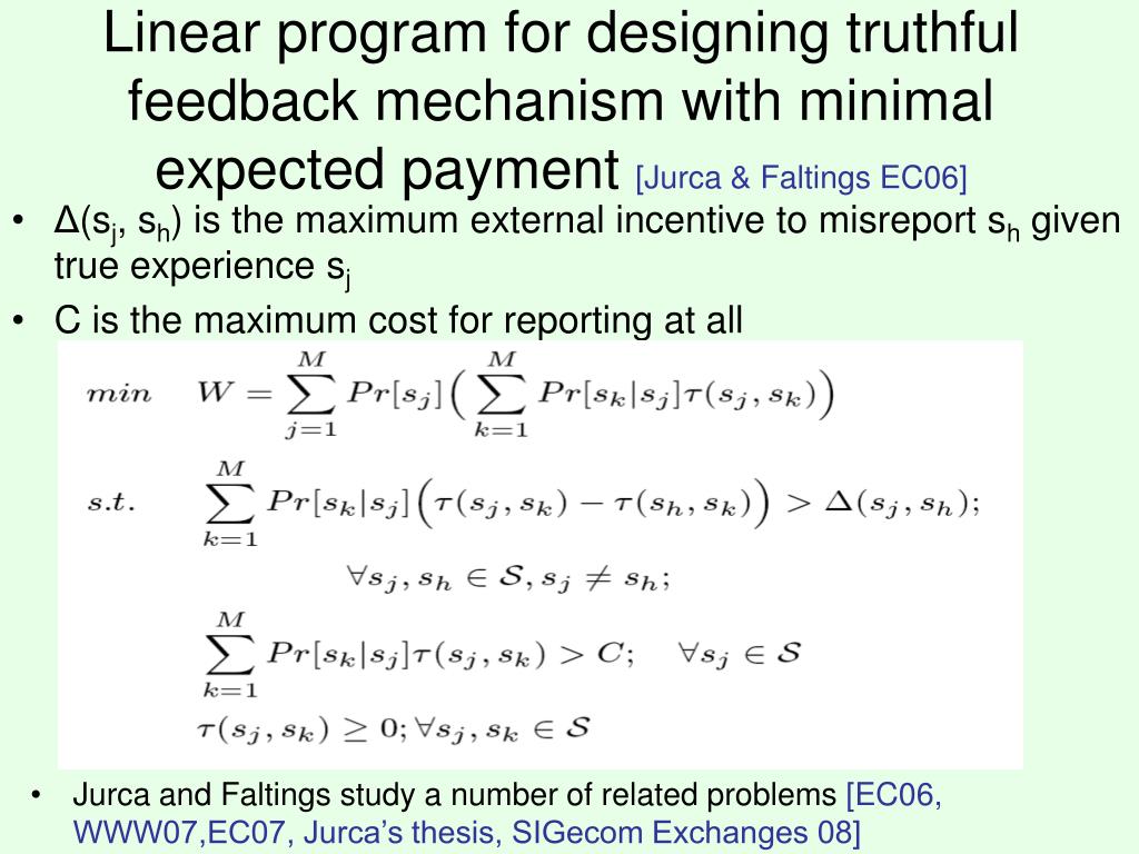 Linear program for designing truthful feedback mechanism with minimal expected payment [Jurca & Faltings EC06] • Δ(sj, sh) is the maximum external incentive to misreport sh given true experience sj • C is the maximum cost for reporting at all • Jurca and Faltings study a number of related problems [EC06, WWW07,EC07, Jurca’s thesis, SIGecom Exchanges 08]
