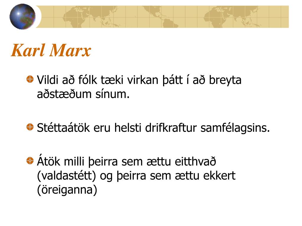 Karl Marx • Vildi að fólk tæki virkan þátt í að breyta aðstæðum sínum. • Stéttaátök eru helsti drifkraftur samfélagsins. • Átök milli þeirra sem ættu eitthvað (valdastétt) og þeirra sem ættu ekkert (öreiganna)
