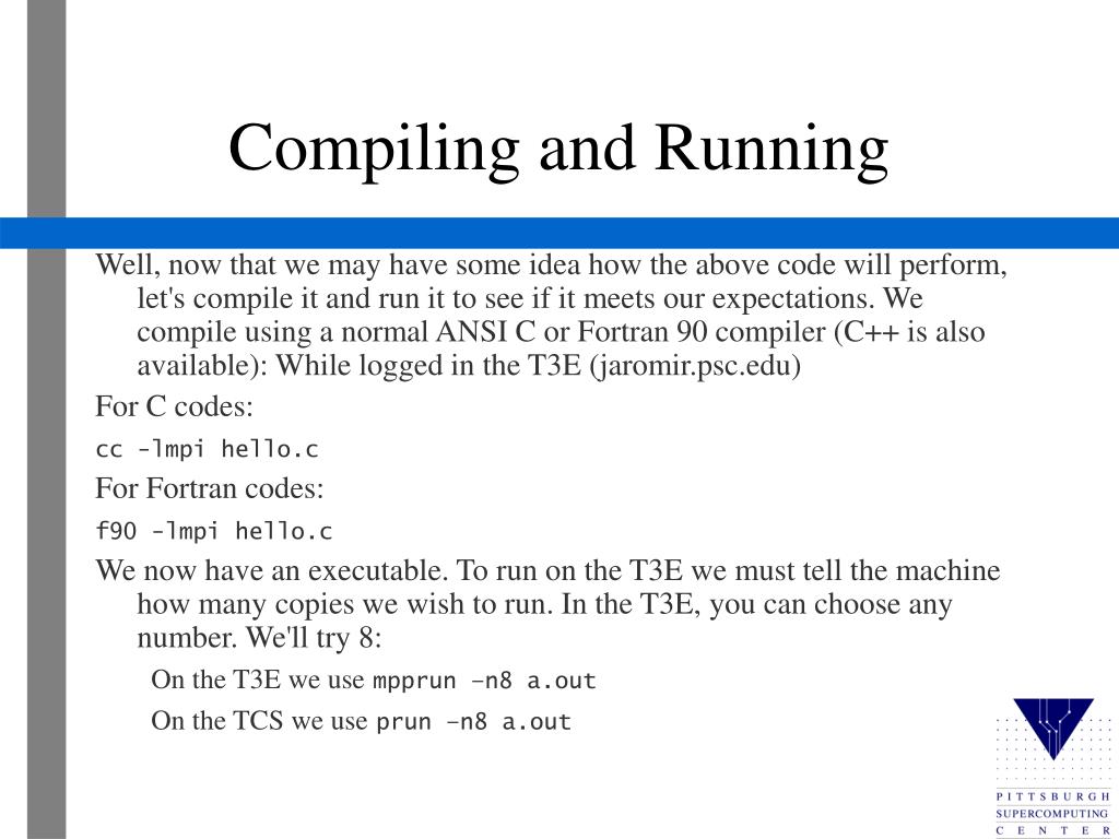 Compiling and Running Well, now that we may have some idea how the above code will perform, let's compile it and run it to see if it meets our expectations. We compile using a normal ANSI C or Fortran 90 compiler (C++ is also available): While logged in the T3E (jaromir.psc.edu) For C codes: cc -lmpi hello.c For Fortran codes: f90 -lmpi hello.c We now have an executable. To run on the T3E we must tell the machine how many copies we wish to run. In the T3E, you can choose any number. We'll try 8: On the T3E we usempprun –n8 a.out On the TCS we useprun –n8 a.out