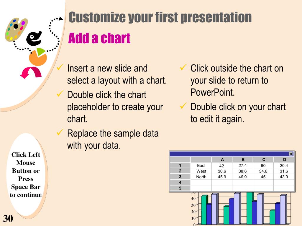 Insert a new slide and select a layout with a chart. Double click the chart placeholder to create your chart. Replace the sample data with your data. Click outside the chart on your slide to return to PowerPoint. Double click on your chart to edit it again. 90 x 80 A B C D 70 East 20.4 27.4 90 20.4 1 60 2 West 30.6 38.6 34.6 31.6 North 45.9 46.9 45 43.9 3 50 4 40 5 30 20 10 0 Customize your first presentation Add a chart 42 30