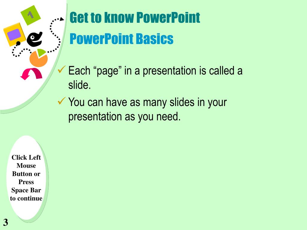Get to know PowerPointPowerPoint Basics 1 • Each “page” in a presentation is called a slide. • You can have as many slides in your presentation as you need. 3