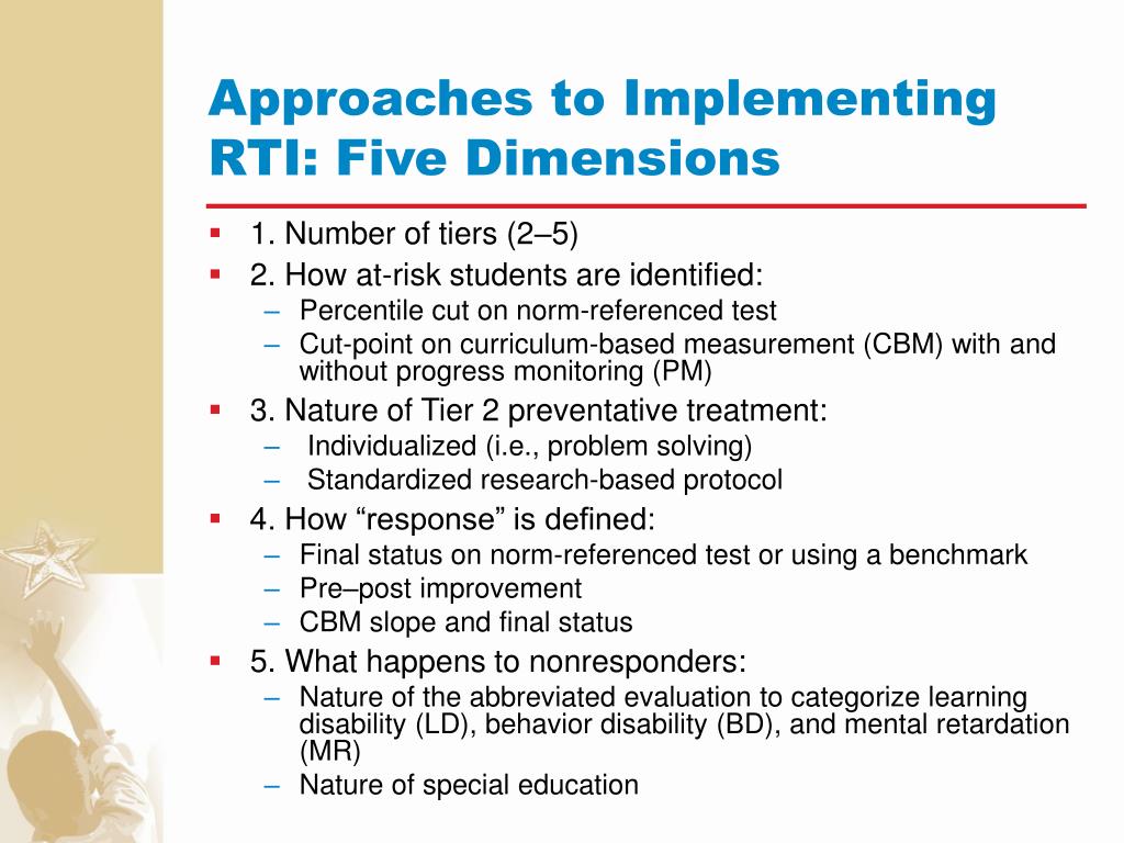 Approaches to Implementing RTI: Five Dimensions • 1. Number of tiers (2–5) • 2. How at-risk students are identified: • Percentile cut on norm-referenced test • Cut-point on curriculum-based measurement (CBM) with and without progress monitoring (PM) • 3. Nature of Tier 2 preventative treatment: • Individualized (i.e., problem solving) • Standardized research-based protocol • 4. How “response” is defined: • Final status on norm-referenced test or using a benchmark • Pre–post improvement • CBM slope and final status • 5. What happens to nonresponders: • Nature of the abbreviated evaluation to categorize learning disability (LD), behavior disability (BD), and mental retardation (MR) • Nature of special education