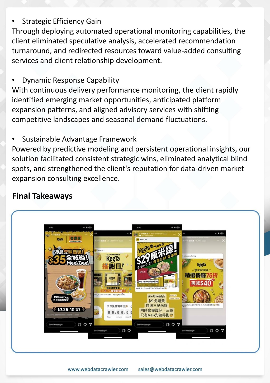 Before partnering with Web Data Crawler's platform, we lacked granular visibility into Keeta's delivery performance metrics across different geographies," explains the client's Strategic Intelligence Director. "Our conventional market research methods provided surface-level insights but missed critical operational patterns. Without systematic approaches for Keeta Market Expansion Strategy analysis, we couldn't identify high- potential markets or advise clients on timing market entry effectively. Understanding Web Scraping Foodhub Reviews Adopting our advanced data collection infrastructure transformed the client's analytical capabilities, delivering unprecedented depth in delivery operations intelligence and enabling evidence-based recommendations across their consulting portfolio. Introduction Within nine months of implementation, they achieved: This case study highlights how our Coupang Product Price Scraping Service revolutionized a client's market analysis and pricing optimization strategy. By deploying advanced techniques, we empowered the client with unmatched insights into the competitive dynamics of South Korea's leading e-commerce platform. • 28% reduction in market research cycle time • 24% growth in consulting engagement renewals • • 42% improvement in market expansion prediction accuracy 31% increase in client satisfaction scores Introduction In today's dynamic quick-commerce landscape, staying competitive requires instant visibility into market pricing trends and consumer preferences. This case study examines how a leading grocery delivery chain with 30+ online stores across major Indian metropolitan areas leveraged Real-Time Grocery Price Monitoring solutions from us to transform their business intelligence capabilities and market positioning strategies. profit margins. Leveraging our specialized Coupang Product Data Scraping Solutions scraping tools, the client gained the strategic edge necessary to excel within Coupang's fast-evolving marketplace. The Client Our customized solution delivered robust market intelligence, enabling clients to drive data- backed pricing decisions, swiftly adapt to market changes, and significantly enhance their The Core Challenges The client struggled with maintaining competitive pricing across thousands of SKUs and identifying regional pricing patterns. They also suffered revenue leakage due to suboptimal pricing strategies. They needed a comprehensive solution to provide detailed insights into quick-commerce market dynamics and enable precise price optimization across their diverse Web scraping involves extracting large amounts of data from websites in an automated manner. Foodhub Reviews Scraper is designed to help businesses collect customer reviews from Foodhub, a popular food delivery platform. grocery catalog. The client revolutionized their approach to pricing strategy and inventory management by By scraping reviews, ratings, and feedback from customers, businesses can gain insights into various aspects of their service, including food quality, delivery times, and customer satisfaction. implementing advanced Grocery Price Data Scraping technologies. This resulted in remarkable improvements in market responsiveness, profit margins, and substantial revenue growth. Instead of relying on manual data collection, Foodhub Reviews Data Collection through scraping allows for real-time access to a large volume of structured data, which is essential for making informed decisions. Client Success Story