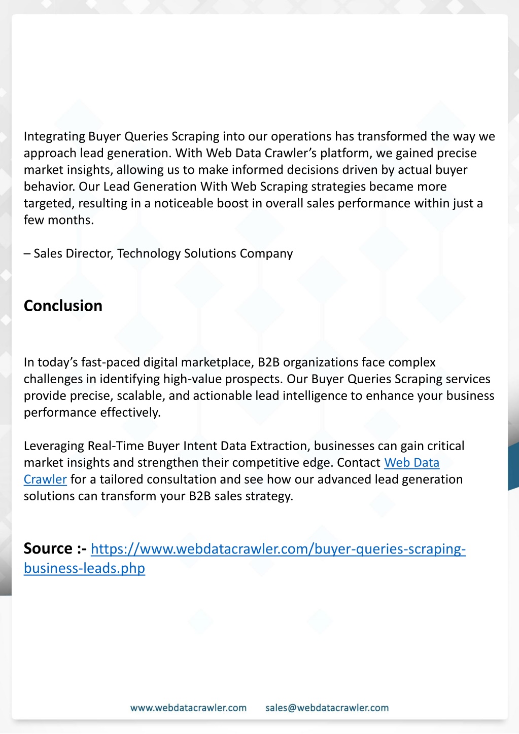 Integrating Buyer Queries Scraping into our operations has transformed the way we approach lead generation. With Web Data Crawler’s platform, we gained precise Understanding Web Scraping Foodhub Reviews market insights, allowing us to make informed decisions driven by actual buyer behavior. Our Lead Generation With Web Scraping strategies became more targeted, resulting in a noticeable boost in overall sales performance within just a few months. – Sales Director, Technology Solutions Company Introduction Conclusion This case study highlights how our Coupang Product Price Scraping Service revolutionized a client's market analysis and pricing optimization strategy. By deploying advanced techniques, we empowered the client with unmatched insights into the competitive dynamics of South Korea's leading e-commerce platform. In today’s fast-paced digital marketplace, B2B organizations face complex challenges in identifying high-value prospects. Our Buyer Queries Scraping services provide precise, scalable, and actionable lead intelligence to enhance your business performance effectively. Introduction In today's dynamic quick-commerce landscape, staying competitive requires instant visibility into market pricing trends and consumer preferences. This case study examines how a leading grocery delivery chain with 30+ online stores across major Indian metropolitan areas leveraged Real-Time Grocery Price Monitoring solutions from us to transform their business intelligence capabilities and market positioning strategies. profit margins. Leveraging our specialized Coupang Product Data Scraping Solutions scraping tools, the client gained the strategic edge necessary to excel within Coupang's fast-evolving marketplace. The Client market insights and strengthen their competitive edge. Contact Web Data Crawler for a tailored consultation and see how our advanced lead generation solutions can transform your B2B sales strategy. Our customized solution delivered robust market intelligence, enabling clients to drive data- backed pricing decisions, swiftly adapt to market changes, and significantly enhance their Leveraging Real-Time Buyer Intent Data Extraction, businesses can gain critical The client struggled with maintaining competitive pricing across thousands of SKUs and identifying regional pricing patterns. They also suffered revenue leakage due to suboptimal pricing strategies. They needed a comprehensive solution to provide detailed insights into quick-commerce market dynamics and enable precise price optimization across their diverse Web scraping involves extracting large amounts of data from websites in an automated manner. Foodhub Reviews Scraper is designed to help businesses collect customer reviews from Foodhub, a popular food delivery platform. grocery catalog. The client revolutionized their approach to pricing strategy and inventory management by Source :- https://www.webdatacrawler.com/buyer-queries-scraping- business-leads.php By scraping reviews, ratings, and feedback from customers, businesses can gain insights into various aspects of their service, including food quality, delivery times, and customer satisfaction. implementing advanced Grocery Price Data Scraping technologies. This resulted in remarkable improvements in market responsiveness, profit margins, and substantial revenue growth. Instead of relying on manual data collection, Foodhub Reviews Data Collection through scraping allows for real-time access to a large volume of structured data, which is essential for making informed decisions. Client Success Story