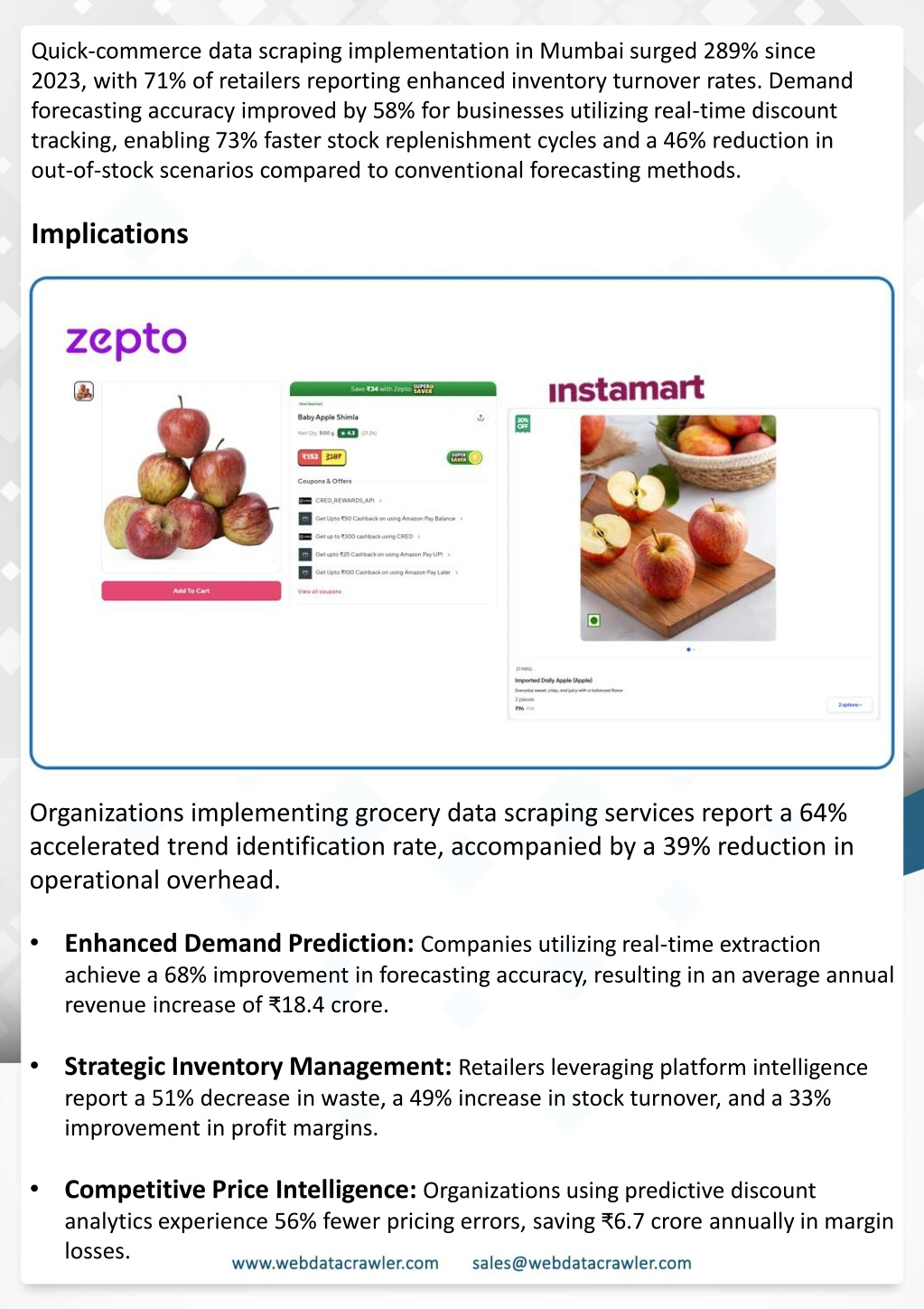 To generate a comprehensive understanding of grocery discount patterns and inventory fluctuations, we executed a systematic, multi-layered methodology: • Advanced Data Collection: We accumulated and analyzed over 4.2 million data points from public inventory databases, quick-commerce platform interfaces, and consumer purchasing systems using Real-Time Inventory Scraping techniques. • Industry Specialist Interviews: Conducted extensive discussions with 48 professionals, including supply chain analysts and retail executives specializing in InstamartZepto Discount Inventory Scraping implementation. • Predictive Analytics Framework: Examined 52 detailed case studies on inventory data extraction from various Indian quick-commerce markets. • Consumer Purchase Behavior Analysis: Tracked real-time consumer buying patterns and discount responsiveness across 34 major Indian metropolitan regions. • Compliance Standards Evaluation: Analyzed regulatory frameworks and developed policies affecting data collection practices in major markets through thorough compliance assessment. • Table 1: Grocery Data Extraction Applications by Implementation Category Understanding Web Scraping Foodhub Reviews Introduction This case study highlights how our Coupang Product Price Scraping Service revolutionized a client's market analysis and pricing optimization strategy. By deploying advanced techniques, we empowered the client with unmatched insights into the competitive dynamics of South Korea's leading e-commerce platform. Our customized solution delivered robust market intelligence, enabling clients to drive data-backed pricing decisions, swiftly adapt to market changes, and significantly enhance their profit margins. Leveraging our specialized Coupang Product Data Scraping Solutions scraping tools, the client gained the strategic edge necessary to excel within Coupang's fast-evolving marketplace. Introduction In today's dynamic quick-commerce landscape, staying competitive requires instant visibility into market pricing trends and consumer preferences. This case study examines how a leading grocery delivery chain with 30+ online stores across major Indian metropolitan areas leveraged Real-Time Grocery Price Monitoring solutions from us to transform their business intelligence capabilities and market positioning strategies. The client struggled with maintaining competitive pricing across thousands of SKUs and identifying regional pricing patterns. They also suffered revenue leakage due to suboptimal pricing strategies. They needed a comprehensive solution to provide detailed insights into quick-commerce market dynamics and enable precise price optimization across their diverse grocery catalog. The client revolutionized their approach to pricing strategy and inventory management by implementing advanced Grocery Price Data Scraping technologies. This resulted in remarkable improvements in market responsiveness, profit margins, and substantial revenue growth. The Client Web scraping involves extracting large amounts of data from websites in an automated manner. Foodhub Reviews Scraper is designed to help businesses collect customer reviews from Foodhub, a popular food delivery platform. By scraping reviews, ratings, and feedback from customers, businesses can gain insights into various aspects of their service, including food quality, delivery times, and customer satisfaction. Instead of relying on manual data collection, Foodhub Reviews Data Collection through scraping allows for real-time access to a large volume of structured data, which is essential for making informed decisions. Client Success Story