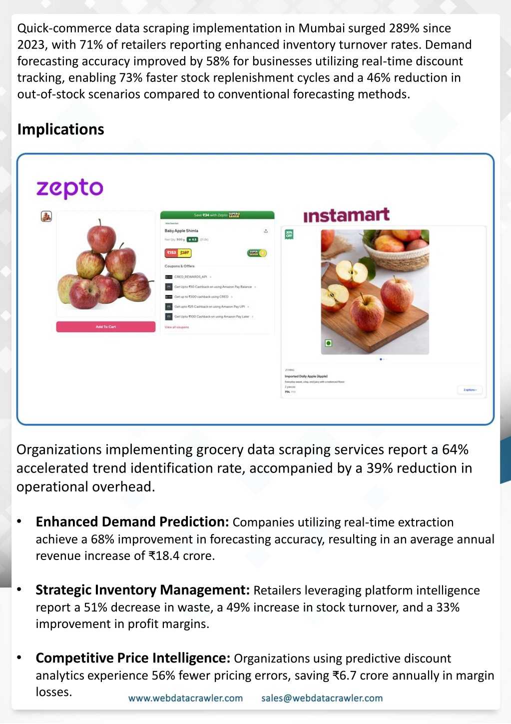 To generate a comprehensive understanding of grocery discount patterns and inventory fluctuations, we executed a systematic, multi- layered methodology: • Advanced Data Collection: We accumulated and analyzed over 4.2 million data points from public inventory databases, quick-commerce platform interfaces, and consumer purchasing systems using Real-Time Inventory Understanding Web Scraping Foodhub Reviews Scraping techniques. • Industry Specialist Interviews: Conducted extensive discussions with 48 professionals, including supply chain analysts and retail executives specializing in Instamart Zepto Discount Inventory Scraping implementation. • Predictive Analytics Framework: Examined 52 detailed case studies on Introduction inventory data extraction from various Indian quick-commerce markets. This case study highlights how our Coupang Product Price Scraping Service revolutionized a client's market analysis and pricing optimization strategy. By deploying advanced techniques, we empowered the client with unmatched insights into the competitive dynamics of South Korea's leading e-commerce platform. regions. • Consumer Purchase Behavior Analysis: Tracked real-time consumer buying patterns and discount responsiveness across 34 major Indian metropolitan Introduction In today's dynamic quick-commerce landscape, staying competitive requires instant visibility into market pricing trends and consumer preferences. This case study examines how a leading grocery delivery chain with 30+ online stores across major Indian metropolitan areas leveraged Real-Time Grocery Price Monitoring solutions from us to transform their business intelligence capabilities and market positioning strategies. profit margins. Leveraging our specialized Coupang Product Data Scraping Solutions scraping tools, the client gained the strategic edge necessary to excel within Coupang's fast-evolving marketplace. The Client Table 1: Grocery Data Extraction Applications by Implementation Category • Our customized solution delivered robust market intelligence, enabling clients to drive data- backed pricing decisions, swiftly adapt to market changes, and significantly enhance their developed policies affecting data collection practices in major markets through thorough compliance assessment. Compliance Standards Evaluation: Analyzed regulatory frameworks and The client struggled with maintaining competitive pricing across thousands of SKUs and identifying regional pricing patterns. They also suffered revenue leakage due to suboptimal pricing strategies. They needed a comprehensive solution to provide detailed insights into quick-commerce market dynamics and enable precise price optimization across their diverse Web scraping involves extracting large amounts of data from websites in an automated manner. Foodhub Reviews Scraper is designed to help businesses collect customer reviews from Foodhub, a popular food delivery platform. grocery catalog. Application Category Adoption Rate Accuracy Rate Setup Investment ROI Potential The client revolutionized their approach to pricing strategy and inventory management by By scraping reviews, ratings, and feedback from customers, businesses can gain insights into various aspects of their service, including food quality, delivery times, and customer satisfaction. implementing advanced Grocery Price Data Scraping technologies. This resulted in remarkable improvements in market responsiveness, profit margins, and substantial revenue growth. Discount Monitoring 88% 91% $32K 47% Instead of relying on manual data collection, Foodhub Reviews Data Collection through scraping allows for real-time access to a large volume of structured data, which is essential for making informed decisions. Client Success Story Price Comparison 76% 94% Inventory Tracking 82% 86% $29K 41% $35K 38% Demand Prediction 69% 83% $44K 52%
