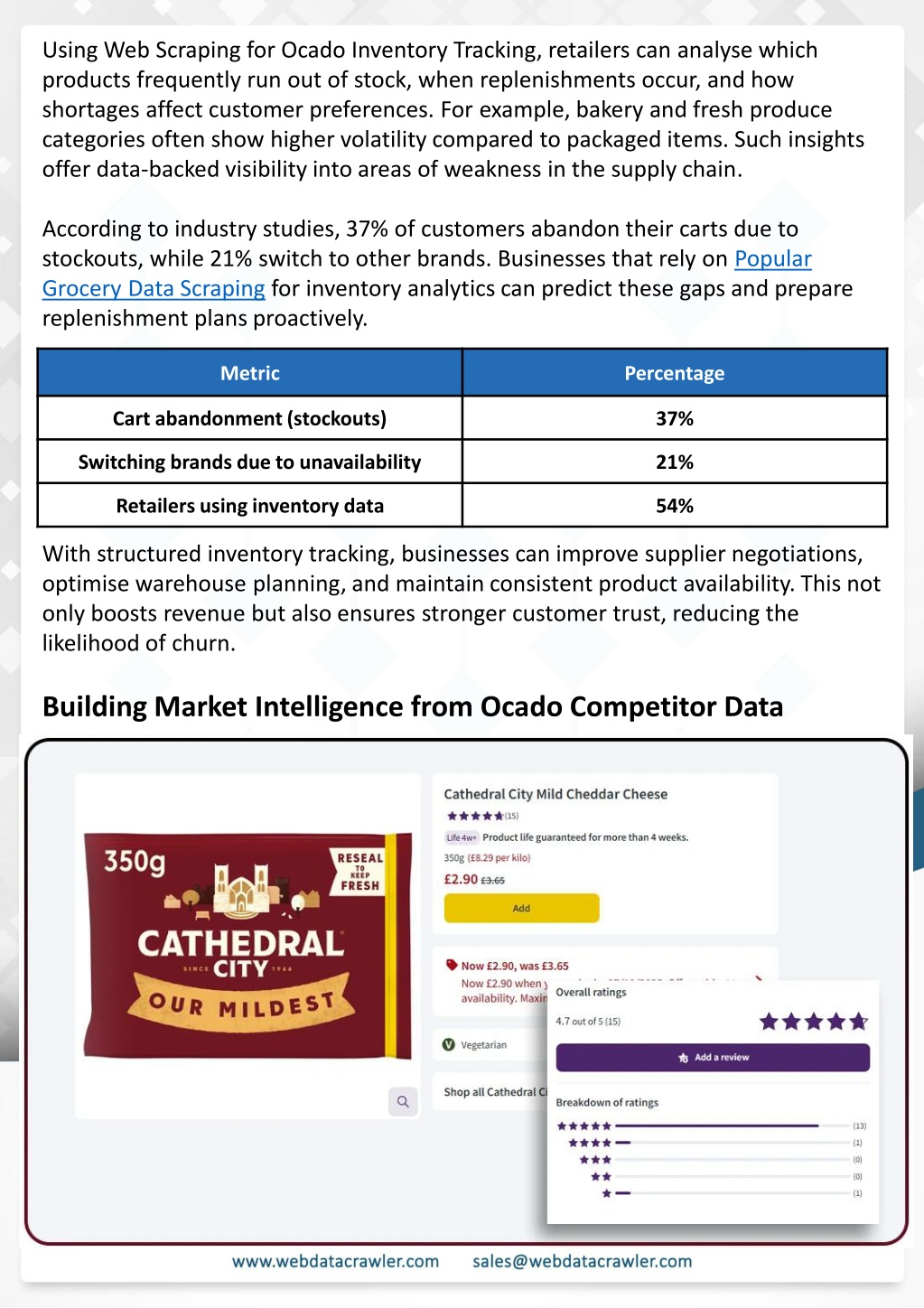 Using Web Scraping for Ocado Inventory Tracking, retailers can analyse which products frequently run out of stock, when replenishments occur, and how shortages affect customer preferences. For example, bakery and fresh produce categories often show higher volatility compared to packaged items. Such insights offer data-backed visibility into areas of weakness in the supply chain. According to industry studies, 37% of customers abandon their carts due to stockouts, while 21% switch to other brands. Businesses that rely on Popular Understanding Web Scraping Foodhub Reviews Grocery Data Scraping for inventory analytics can predict these gaps and prepare replenishment plans proactively. Metric Percentage Cart abandonment (stockouts) 37% Switching brands due to unavailability 21% Introduction Retailers using inventory data 54% With structured inventory tracking, businesses can improve supplier negotiations, optimise warehouse planning, and maintain consistent product availability. This not only boosts revenue but also ensures stronger customer trust, reducing the This case study highlights how our Coupang Product Price Scraping Service revolutionized a client's market analysis and pricing optimization strategy. By deploying advanced techniques, we empowered the client with unmatched insights into the competitive dynamics of South Korea's leading e-commerce platform. likelihood of churn. Introduction In today's dynamic quick-commerce landscape, staying competitive requires instant visibility into market pricing trends and consumer preferences. This case study examines how a leading grocery delivery chain with 30+ online stores across major Indian metropolitan areas leveraged Real-Time Grocery Price Monitoring solutions from us to transform their business intelligence capabilities and market positioning strategies. profit margins. Leveraging our specialized Coupang Product Data Scraping Solutions scraping tools, the client gained the strategic edge necessary to excel within Coupang's fast-evolving marketplace. The Client Our customized solution delivered robust market intelligence, enabling clients to drive data- backed pricing decisions, swiftly adapt to market changes, and significantly enhance their Building Market Intelligence from Ocado Competitor Data The client struggled with maintaining competitive pricing across thousands of SKUs and identifying regional pricing patterns. They also suffered revenue leakage due to suboptimal pricing strategies. They needed a comprehensive solution to provide detailed insights into quick-commerce market dynamics and enable precise price optimization across their diverse Web scraping involves extracting large amounts of data from websites in an automated manner. Foodhub Reviews Scraper is designed to help businesses collect customer reviews from Foodhub, a popular food delivery platform. grocery catalog. The client revolutionized their approach to pricing strategy and inventory management by By scraping reviews, ratings, and feedback from customers, businesses can gain insights into various aspects of their service, including food quality, delivery times, and customer satisfaction. implementing advanced Grocery Price Data Scraping technologies. This resulted in remarkable improvements in market responsiveness, profit margins, and substantial revenue growth. Instead of relying on manual data collection, Foodhub Reviews Data Collection through scraping allows for real-time access to a large volume of structured data, which is essential for making informed decisions. Client Success Story