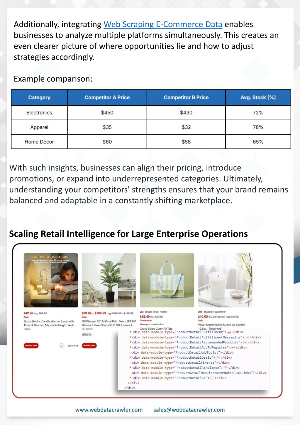 Conclusion In today’s retail industry, timely data is no longer optional—it’s a Understanding Web Scraping Foodhub Reviews necessity. Businesses that invest in Target Data Scraping can confidently make informed decisions about pricing, stock levels, and customer demand. By automating product monitoring, companies reduce operational inefficiencies and ensure they don’t miss opportunities in a fast-changing marketplace. Introduction Beyond pricing and availability, robust analytics with Target Product Availability Data enable enterprises to anticipate demand, prevent stockouts, and align better with consumer expectations. To take advantage of more intelligent insights and future-ready solutions. Contact Web Data Crawler now to transform your retail data into a potent competitive edge. This case study highlights how our Coupang Product Price Scraping Service revolutionized a client's market analysis and pricing optimization strategy. By deploying advanced techniques, we empowered the client with unmatched insights into the competitive dynamics of South Korea's leading e-commerce platform. Introduction In today's dynamic quick-commerce landscape, staying competitive requires instant visibility into market pricing trends and consumer preferences. This case study examines how a leading grocery delivery chain with 30+ online stores across major Indian metropolitan areas leveraged Real-Time Grocery Price Monitoring solutions from us to transform their business intelligence capabilities and market positioning strategies. profit margins. Leveraging our specialized Coupang Product Data Scraping Solutions scraping tools, the client gained the strategic edge necessary to excel within Coupang's fast-evolving marketplace. The Client Our customized solution delivered robust market intelligence, enabling clients to drive data- backed pricing decisions, swiftly adapt to market changes, and significantly enhance their Source: https://www.webdatacrawler.com/target-scraping-pricing-stock.php The client struggled with maintaining competitive pricing across thousands of SKUs and identifying regional pricing patterns. They also suffered revenue leakage due to suboptimal pricing strategies. They needed a comprehensive solution to provide detailed insights into quick-commerce market dynamics and enable precise price optimization across their diverse Web scraping involves extracting large amounts of data from websites in an automated manner. Foodhub Reviews Scraper is designed to help businesses collect customer reviews from Foodhub, a popular food delivery platform. grocery catalog. The client revolutionized their approach to pricing strategy and inventory management by By scraping reviews, ratings, and feedback from customers, businesses can gain insights into various aspects of their service, including food quality, delivery times, and customer satisfaction. implementing advanced Grocery Price Data Scraping technologies. This resulted in remarkable improvements in market responsiveness, profit margins, and substantial revenue growth. Instead of relying on manual data collection, Foodhub Reviews Data Collection through scraping allows for real-time access to a large volume of structured data, which is essential for making informed decisions. Client Success Story