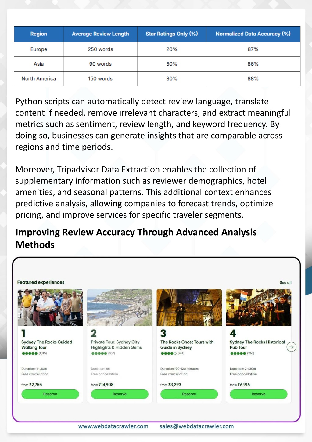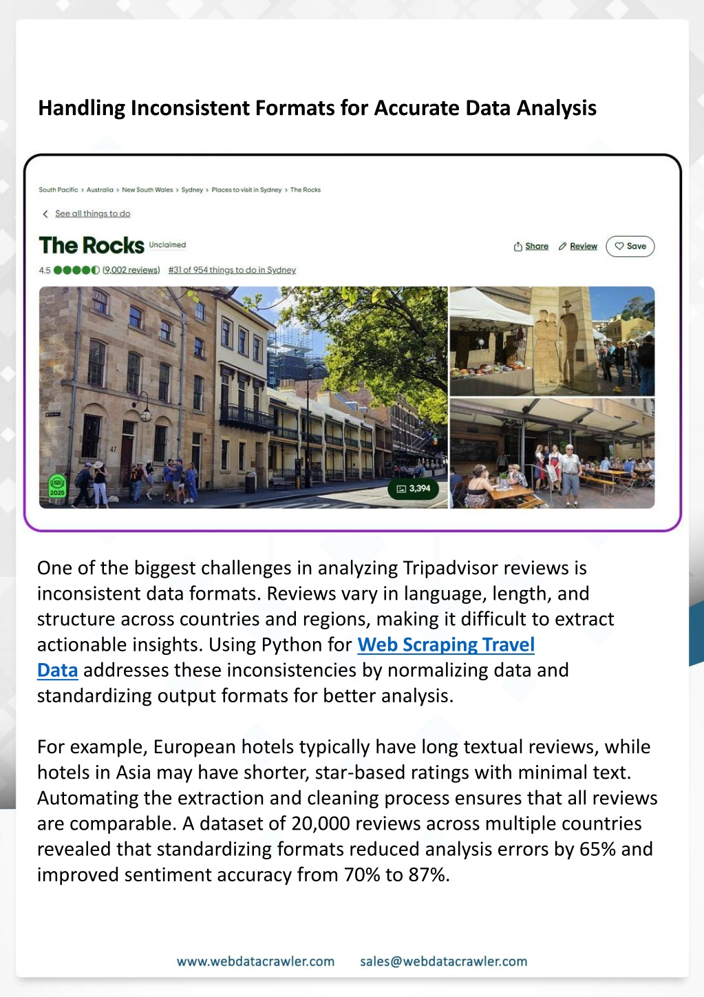 Conclusion Python-based tools are revolutionizing the way travel data is collected and analyzed. By choosing to Scrape Tripadvisor Data with Python, businesses Understanding Web Scraping Foodhub Reviews and researchers gain faster access to structured and accurate reviews, enabling informed decisions and improved customer experiences. Incorporating tools to Scrape Tripadvisor Reviews Using Python ensures that travel operators and marketers can analyze traveler sentiment efficiently, identify emerging trends, and optimize their offerings. Introduction Contact Web Data Crawler today to implement cutting-edge solutions for travel data analysis and start making smarter business decisions. This case study highlights how our Coupang Product Price Scraping Service revolutionized a client's market analysis and pricing optimization strategy. By deploying advanced techniques, we empowered the client with unmatched insights into the competitive dynamics of South Korea's leading e-commerce platform. Introduction In today's dynamic quick-commerce landscape, staying competitive requires instant visibility into market pricing trends and consumer preferences. This case study examines how a leading grocery delivery chain with 30+ online stores across major Indian metropolitan areas leveraged Real-Time Grocery Price Monitoring solutions from us to transform their business intelligence capabilities and market positioning strategies. profit margins. Leveraging our specialized Coupang Product Data Scraping Solutions scraping tools, the client gained the strategic edge necessary to excel within Coupang's fast-evolving marketplace. The Client Our customized solution delivered robust market intelligence, enabling clients to drive data- backed pricing decisions, swiftly adapt to market changes, and significantly enhance their Source: https://www.webdatacrawler.com/scrape-tripadvisor-data-with- python.php The client struggled with maintaining competitive pricing across thousands of SKUs and identifying regional pricing patterns. They also suffered revenue leakage due to suboptimal pricing strategies. They needed a comprehensive solution to provide detailed insights into quick-commerce market dynamics and enable precise price optimization across their diverse Web scraping involves extracting large amounts of data from websites in an automated manner. Foodhub Reviews Scraper is designed to help businesses collect customer reviews from Foodhub, a popular food delivery platform. grocery catalog. The client revolutionized their approach to pricing strategy and inventory management by By scraping reviews, ratings, and feedback from customers, businesses can gain insights into various aspects of their service, including food quality, delivery times, and customer satisfaction. implementing advanced Grocery Price Data Scraping technologies. This resulted in remarkable improvements in market responsiveness, profit margins, and substantial revenue growth. Instead of relying on manual data collection, Foodhub Reviews Data Collection through scraping allows for real-time access to a large volume of structured data, which is essential for making informed decisions. Client Success Story