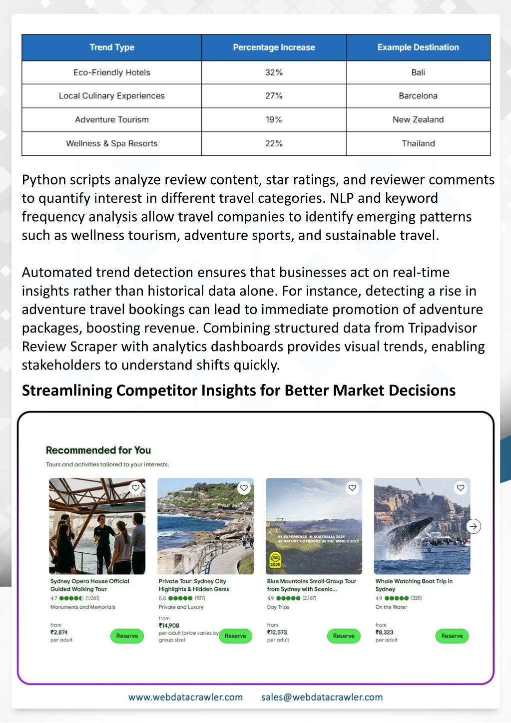 Spotting Emerging Trends in Traveler Preferences Effectively Understanding Web Scraping Foodhub Reviews Introduction This case study highlights how our Coupang Product Price Scraping Service revolutionized a client's market analysis and pricing optimization strategy. By deploying advanced techniques, we empowered the client with unmatched insights into the competitive dynamics of South Korea's leading e-commerce platform. Introduction In today's dynamic quick-commerce landscape, staying competitive requires instant visibility into market pricing trends and consumer preferences. This case study examines how a leading grocery delivery chain with 30+ online stores across major Indian metropolitan areas leveraged Real-Time Grocery Price Monitoring solutions from us to transform their business intelligence capabilities and market positioning strategies. profit margins. Leveraging our specialized Coupang Product Data Scraping Solutions scraping tools, the client gained the strategic edge necessary to excel within Coupang's fast-evolving marketplace. The Client is insufficient, as it often misses subtle shifts in traveler preferences. By using Python automation, organizations can use Tripadvisor Travel Data Our customized solution delivered robust market intelligence, enabling clients to drive data- backed pricing decisions, swiftly adapt to market changes, and significantly enhance their Understanding emerging trends is crucial for travel businesses aiming to stay relevant and competitive. Manual observation of Tripadvisor reviews The client struggled with maintaining competitive pricing across thousands of SKUs and identifying regional pricing patterns. They also suffered revenue leakage due to suboptimal pricing strategies. They needed a comprehensive solution to provide detailed insights into quick-commerce market dynamics and enable precise price optimization across their diverse Web scraping involves extracting large amounts of data from websites in an automated manner. Foodhub Reviews Scraper is designed to help businesses collect customer reviews from Foodhub, a popular food delivery platform. grocery catalog. Insights to detect trends such as popular destinations, high-demand amenities, and seasonal travel patterns. The client revolutionized their approach to pricing strategy and inventory management by By scraping reviews, ratings, and feedback from customers, businesses can gain insights into various aspects of their service, including food quality, delivery times, and customer satisfaction. implementing advanced Grocery Price Data Scraping technologies. This resulted in remarkable improvements in market responsiveness, profit margins, and substantial revenue growth. highlighted a 32% increase in eco-friendly hotel bookings and a 27% surge in culinary experience-focused travel. Detecting these patterns early allows businesses to tailor their offerings, create specialized travel packages, and adjust marketing strategies to attract the right audience. For example, a dataset of 50,000 hotel reviews collected over 12 months Instead of relying on manual data collection, Foodhub Reviews Data Collection through scraping allows for real-time access to a large volume of structured data, which is essential for making informed decisions. Client Success Story
