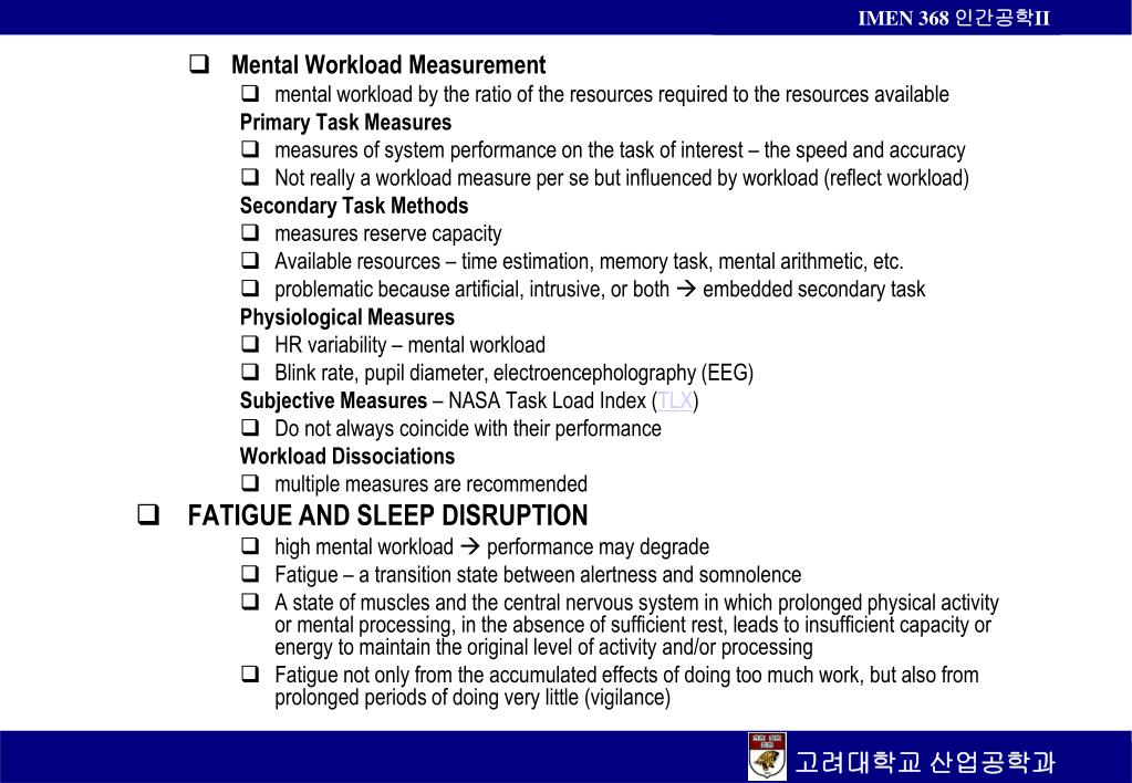 Mental Workload Measurement • mental workload by the ratio of the resources required to the resources available Primary Task Measures • measures of system performance on the task of interest – the speed and accuracy • Not really a workload measure per se but influenced by workload (reflect workload) Secondary Task Methods • measures reserve capacity • Available resources – time estimation, memory task, mental arithmetic, etc. • problematic because artificial, intrusive, or both embedded secondary task Physiological Measures • HR variability – mental workload • Blink rate, pupil diameter, electroencepholography (EEG) Subjective Measures – NASA Task Load Index (TLX) • Do notalways coincide with their performance Workload Dissociations • multiple measures are recommended • FATIGUE AND SLEEP DISRUPTION • high mental workload performance may degrade • Fatigue – a transition state between alertness and somnolence • A state of muscles and the central nervous system in which prolonged physical activity or mental processing, in the absence of sufficient rest, leads to insufficient capacity or energy to maintain the original level of activity and/or processing • Fatigue not only from the accumulated effects of doing too much work, but also from prolonged periods of doing very little (vigilance)