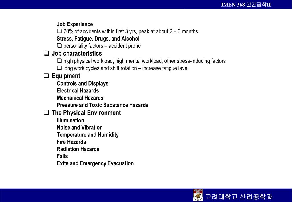 Job Experience • 70% of accidents within first 3 yrs, peak at about 2 – 3 months Stress, Fatigue, Drugs, and Alcohol • personality factors – accident prone • Job characteristics • high physical workload, high mental workload, other stress-inducing factors • long work cycles and shift rotation – increase fatigue level • Equipment Controls and Displays Electrical Hazards Mechanical Hazards Pressure and Toxic Substance Hazards • The Physical Environment Illumination Noise and Vibration Temperature and Humidity Fire Hazards Radiation Hazards Falls Exits and Emergency Evacuation