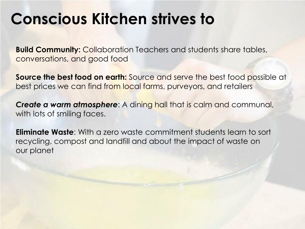 Conscious Kitchen strives to • Build Community: Collaboration Teachers and students share tables, conversations, and good food • Source the best food on earth: Source and serve the best food possible at best prices we can find from local farms, purveyors, and retailers • Create a warm atmosphere: A dining hall that is calm and communal, with lots of smiling faces. • Eliminate Waste: With a zero waste commitment students learn to sort recycling, compost and landfill and about the impact of waste on our planet