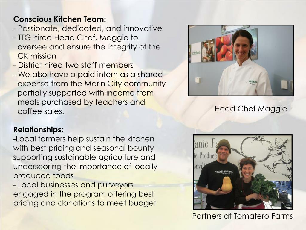 Conscious Kitchen Team: • - Passionate, dedicated, and innovative • TTG hired Head Chef, Maggie to • oversee and ensure the integrity of the • CK mission • District hired two staff members • We also have a paid intern as a shared • expense from the Marin City community • partially supported with income from • meals purchased by teachers and • coffee sales. • Relationships: • Local farmers help sustain the kitchen with best pricing and seasonal bounty supporting sustainable agriculture and underscoring the importance of locally produced foods • - Local businesses and purveyors engaged in the program offering best pricing and donations to meet budget Head Chef Maggie Partners at Tomatero Farms