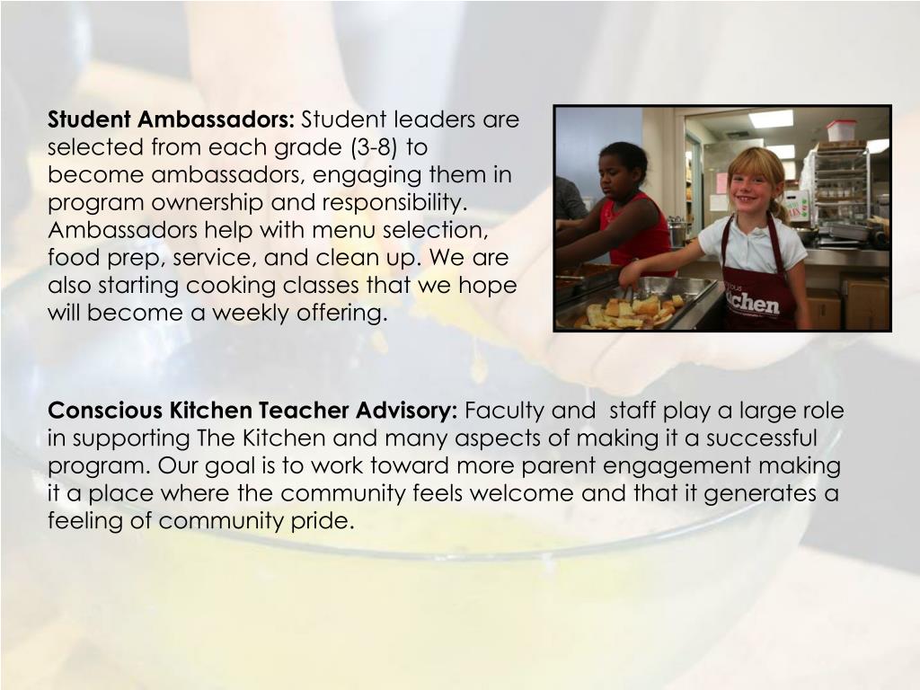 Student Ambassadors: Student leaders are selected from each grade (3-8) to become ambassadors, engaging them in program ownership and responsibility. Ambassadors help with menu selection, food prep, service, and clean up. We are also starting cooking classes that we hope will become a weekly offering. Conscious Kitchen Teacher Advisory: Faculty and staff play a large role in supporting The Kitchen and many aspects of making it a successful program. Our goal is to work toward more parent engagement making it a place where the community feels welcome and that it generates a feeling of community pride.