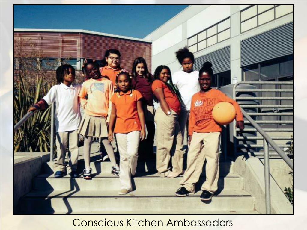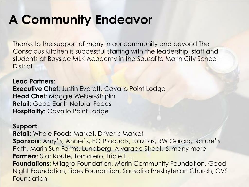 A Community Endeavor Thanks to the support of many in our community and beyond The Conscious Kitchen is successful starting with the leadership, staff and students at Bayside MLK Academy in the Sausalito Marin City School District Lead Partners: Executive Chef: Justin Everett, Cavallo Point Lodge Head Chef: Maggie Weber-Striplin Retail: Good Earth Natural Foods Hospitality: Cavallo Point Lodge Support: Retail: Whole Foods Market, Driver’s Market Sponsors: Amy’s, Annie’s, EO Products, Navitas, RW Garcia, Nature’s Path, Marin Sun Farms, Lundberg, Alvarado Street, & many more Farmers: Star Route, Tomatero, Triple T … Foundations: Milagro Foundation, Marin Community Foundation, Good Night Foundation, Tides Foundation, Sausalito Presbyterian Church, CVS Foundation