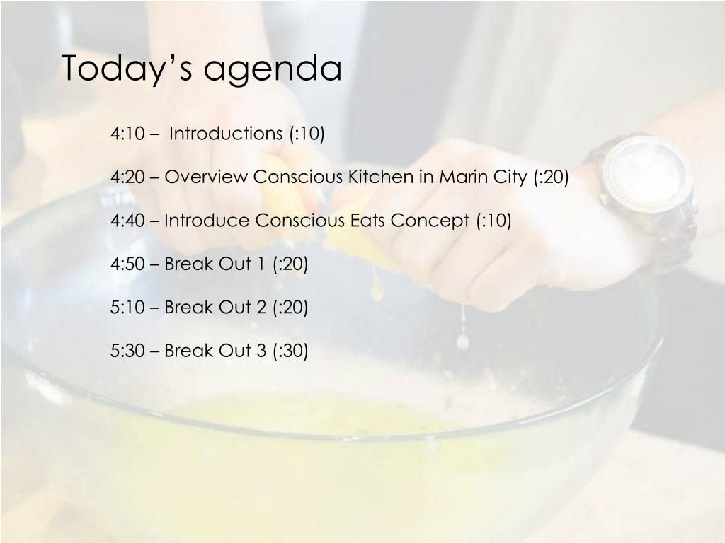 Today’s agenda 4:10 – Introductions (:10) 4:20 – Overview Conscious Kitchen in Marin City (:20) 4:40 – Introduce Conscious Eats Concept (:10) 4:50 – Break Out 1 (:20) 5:10 – Break Out 2 (:20) 5:30 – Break Out 3 (:30)
