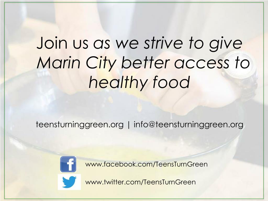 Join us as we strive to give Marin City better access to • healthy food • teensturninggreen.org | info@teensturninggreen.org www.facebook.com/TeensTurnGreen www.twitter.com/TeensTurnGreen