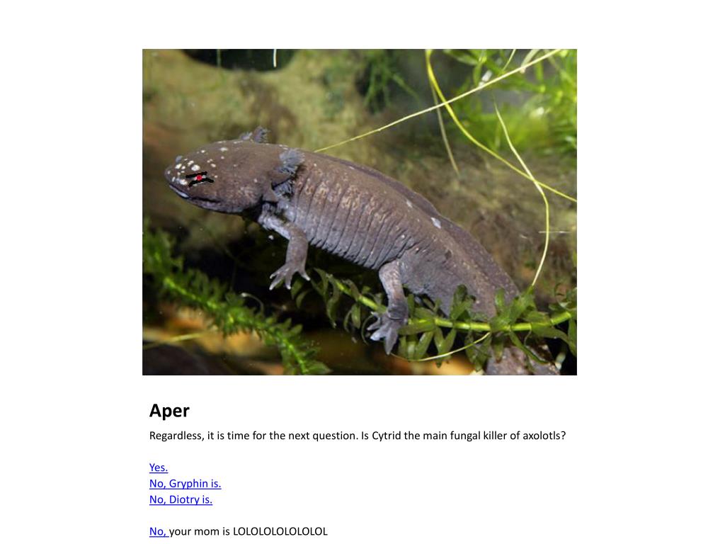 Aper Regardless, it is time for the next question. Is Cytrid the main fungal killer of axolotls? Yes. No, Gryphin is. No, Diotry is. No, your mom is LOLOLOLOLOLOLOL