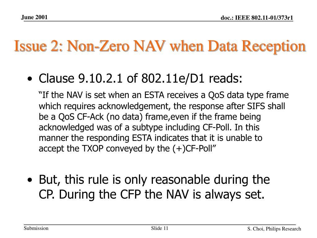 Issue 2: Non-Zero NAV when Data Reception • Clause 9.10.2.1 of 802.11e/D1 reads: “If the NAV is set when an ESTA receives a QoS data type frame which requires acknowledgement, the response after SIFS shall be a QoS CF-Ack (no data) frame,even if the frame being acknowledged was of a subtype including CF-Poll. In this manner the responding ESTA indicates that it is unable to accept the TXOP conveyed by the (+)CF-Poll” • But, this rule is only reasonable during the CP. During the CFP the NAV is always set.