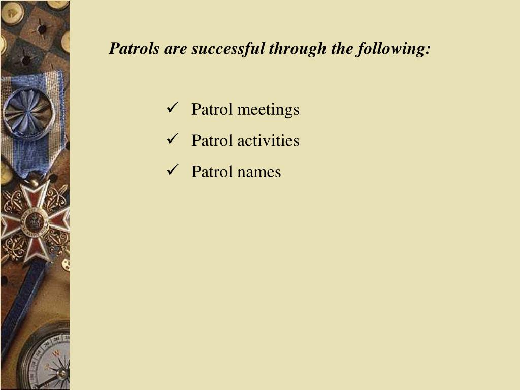 Patrols are successful through the following: • Patrol meetings • Patrol activities • Patrol names