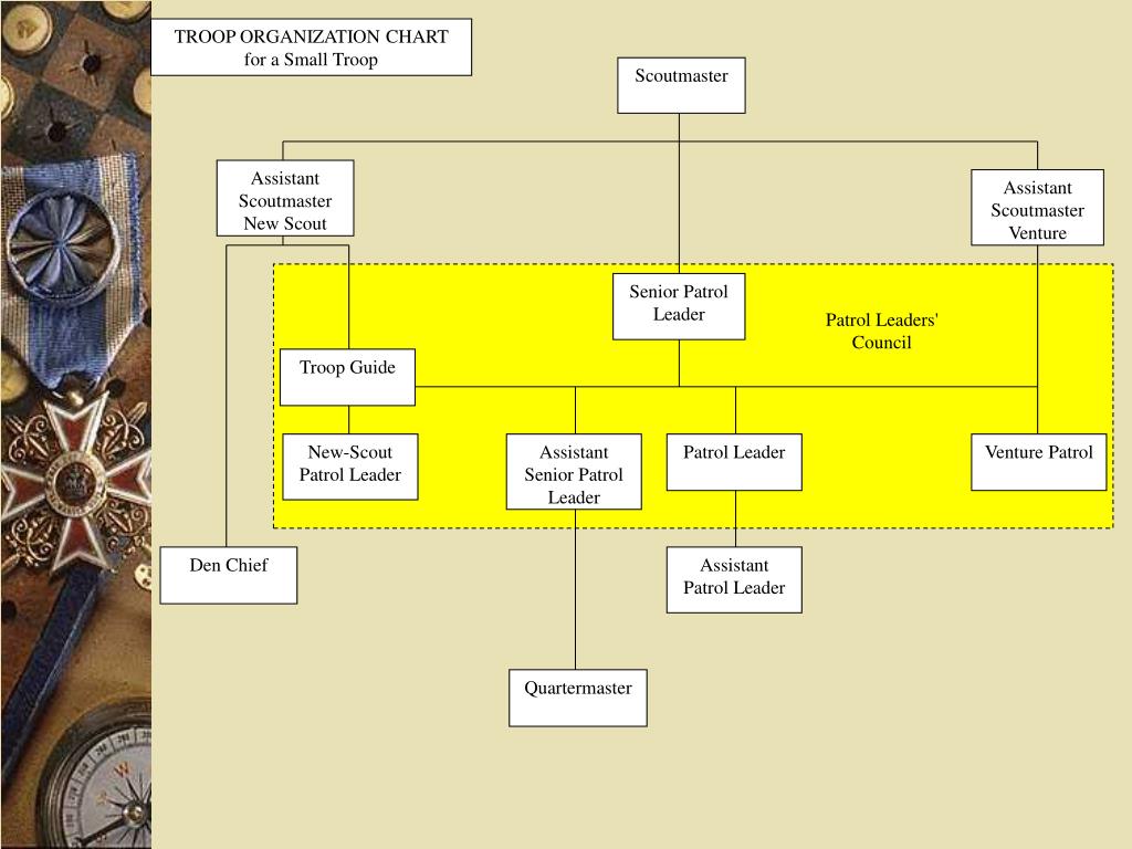 TROOP ORGANIZATION CHART for a Small Troop Scoutmaster Assistant Scoutmaster New Scout Assistant Scoutmaster Venture Senior Patrol Leader Patrol Leaders' Council Troop Guide New-Scout Patrol Leader Assistant Senior Patrol Leader Patrol Leader Venture Patrol Den Chief Assistant Patrol Leader Quartermaster