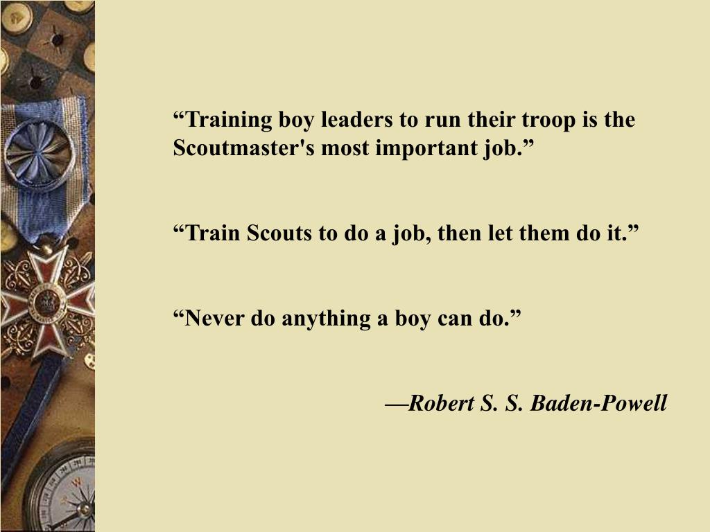 “Training boy leaders to run their troop is the Scoutmaster's most important job.” “Train Scouts to do a job, then let them do it.” “Never do anything a boy can do.” —Robert S. S. Baden-Powell