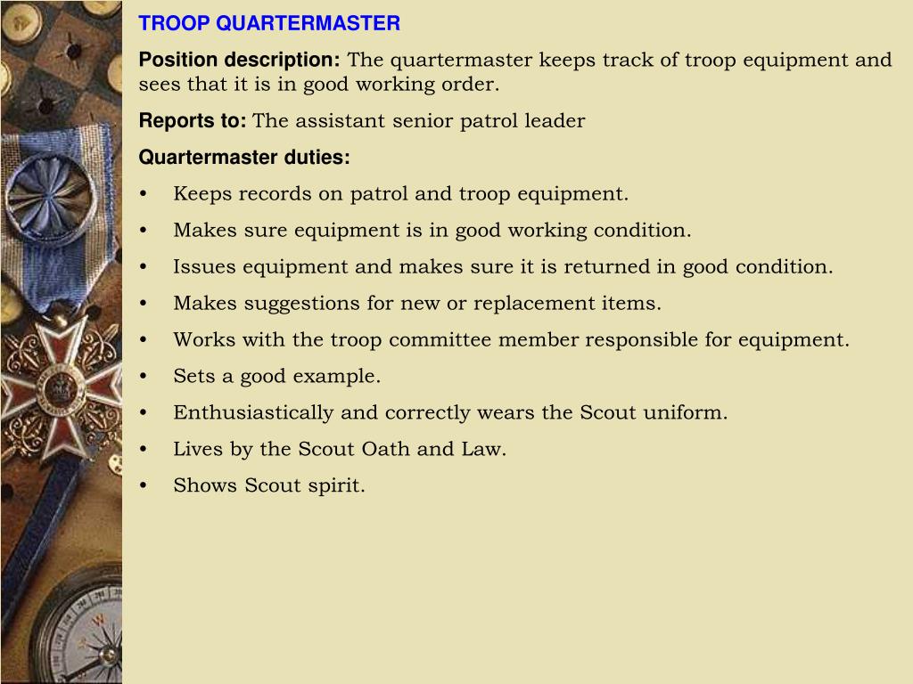 TROOP QUARTERMASTER • Position description:The quartermaster keeps track of troop equipment and seesthat it is ingood working order. • Reports to: The assistant senior patrol leader • Quartermaster duties: • Keeps records on patrol and troop equipment. • Makes sure equipment is in good working condition. • Issues equipment and makes sure it is returned in good condition. • Makes suggestions for new or replacement items. • Works with the troop committee member responsible for equipment. • Sets a good example. • Enthusiastically and correctly wears the Scout uniform. • Lives by the Scout Oath and Law. • Shows Scout spirit.