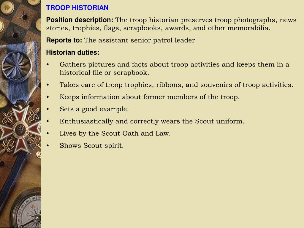 TROOP HISTORIAN • Position description: The troop historian preserves troop photographs, news stories, trophies, flags, scrapbooks, awards, and other memorabilia. • Reports to: The assistant senior patrol leader • Historian duties: • Gathers pictures and facts about troop activities and keeps them in a historical file or scrapbook. • Takes care of troop trophies, ribbons, and souvenirs of troop activities. • Keeps information about former members of the troop. • Sets a good example. • Enthusiastically and correctly wears the Scout uniform. • Lives by the Scout Oath and Law. • Shows Scout spirit.