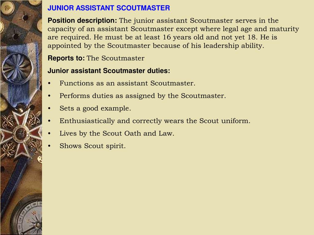 JUNIOR ASSISTANT SCOUTMASTER • Position description: The junior assistant Scoutmaster serves in the capacity of an assistant Scoutmaster except where legal age and maturity are required. He must be at least 16 years old and not yet 18. He is appointed by the Scoutmaster because of his leadership ability. • Reports to:The Scoutmaster • Junior assistant Scoutmaster duties: • Functions as an assistant Scoutmaster. • Performs duties as assigned by the Scoutmaster. • Sets a good example. • Enthusiastically and correctly wears the Scout uniform. • Lives by the Scout Oath and Law. • Shows Scout spirit.
