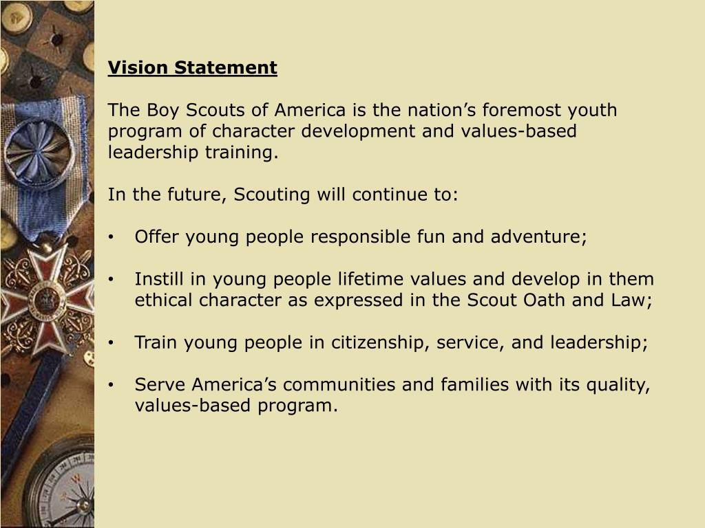 Vision Statement • The Boy Scouts of America is the nation’s foremost youth program of character development and values-based leadership training. • In the future, Scouting will continue to: • Offer young people responsible fun and adventure; • Instill in young people lifetime values and develop in them ethical character as expressed in the Scout Oath and Law; • Train young people in citizenship, service, and leadership; • Serve America’s communities and families with its quality, values-based program.