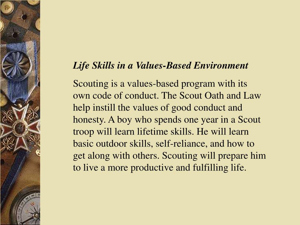 Life Skills in a Values-Based Environment Scouting is a values-based program with its own code of conduct. The Scout Oath and Law help instill the values of good conduct and honesty. A boy who spends one year in a Scout troop will learn lifetime skills. He will learn basic outdoor skills, self-reliance, and how to get along with others. Scouting will prepare him to live a more productive and fulfilling life.