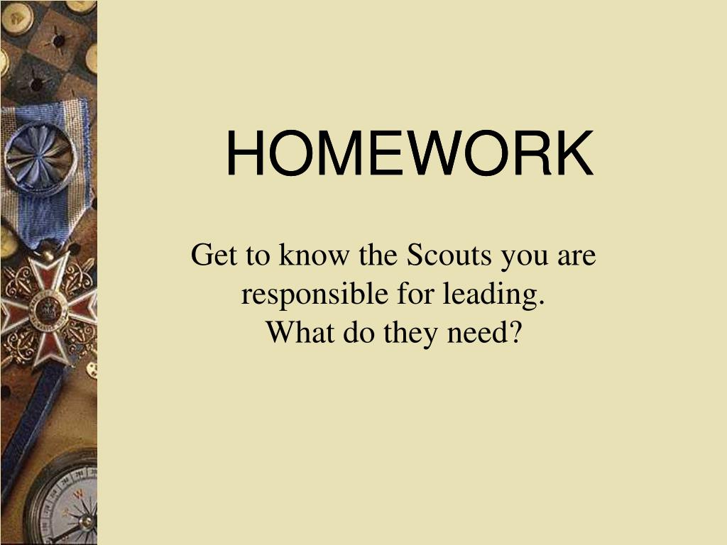 HOMEWORK HOMEWORK Get to know the Scouts you are responsible for leading. What do they need?