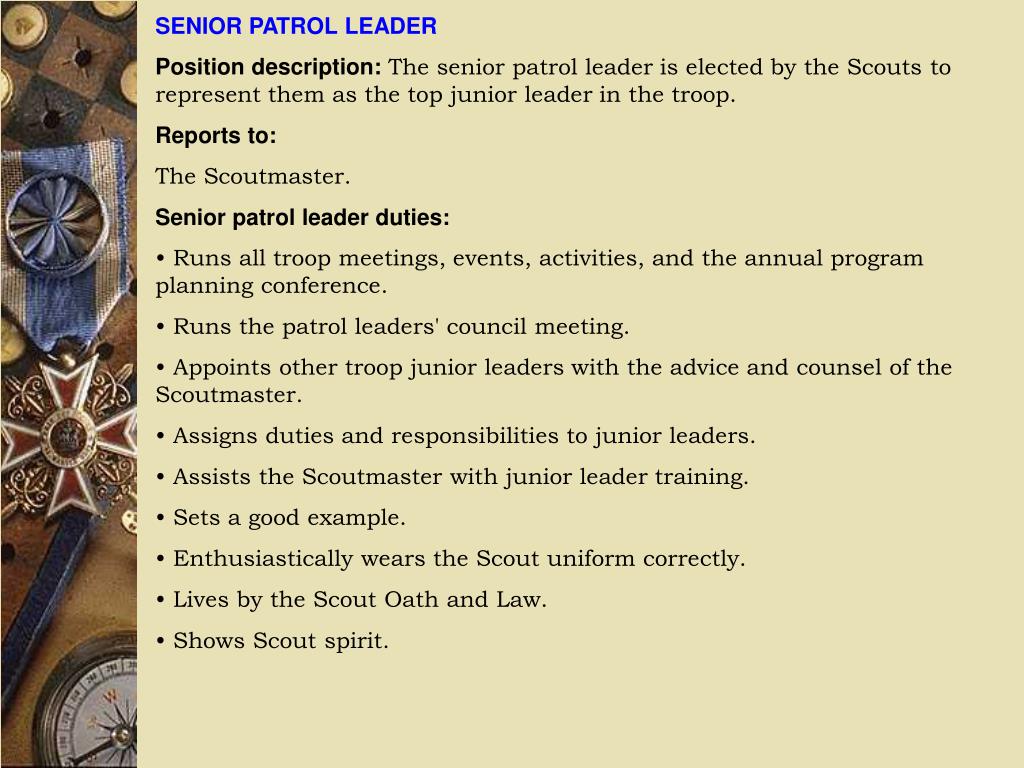 SENIOR PATROL LEADER • Position description: The senior patrol leader is elected by the Scouts to represent them as the top youth leader in the troop. • Reports to: The Scoutmaster • Senior patrol leader duties: • Runs all troop meetings, events, activities, and the annual program planning conference. • Runs the patrol leaders' council meeting. • Appoints other troop youth leaders with the advice and counsel of the Scoutmaster. • Assigns duties and responsibilities to youth leaders. • Assists the Scoutmaster with youth leadership training. • Sets a good example. • Enthusiastically wears the Scout uniform correctly. • Lives by the Scout Oath and Law. • Shows Scout spirit.