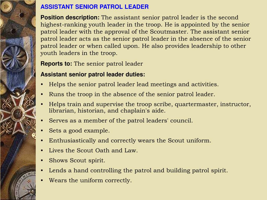 ASSISTANT SENIOR PATROL LEADER • Position description: The assistant senior patrol leader is the second highest-ranking youth leader in the troop. He is appointed by the senior patrol leader with the approval of the Scoutmaster. The assistant senior patrol leader acts as the senior patrol leader in the absence of the senior patrol leader or when called upon. He also provides leadership to other youth leaders in the troop. • Reports to:The senior patrol leader • Assistant senior patrol leader duties: • Helps the senior patrol leader lead meetings and activities. • Runs the troop in the absence of the senior patrol leader. • Helps train and supervise the troop scribe, quartermaster, instructor, librarian, historian, and chaplain's aide. • Serves as a member of the patrol leaders' council. • Sets a good example. • Enthusiastically and correctly wears the Scout uniform. • Lives the Scout Oath and Law. • Shows Scout spirit. • Lends a hand controlling the patrol and building patrol spirit. • Wears the uniform correctly.
