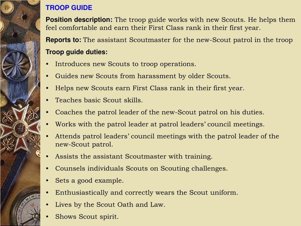 TROOP GUIDE • Position description:The troop guide works with new Scouts. He helps them feel comfortable and earn their First Class rank in their first year. • Reports to:The assistant Scoutmaster for the new-Scout patrol in the troop • Troop guide duties: • Introduces new Scouts to troop operations. • Guides new Scouts from harassment by older Scouts. • Helps new Scouts earn First Class rank in their first year. • Teaches basic Scout skills. • Coaches the patrol leader of the new-Scout patrol on his duties. • Works with the patrol leader at patrol leaders’ council meetings. • Attends patrol leaders’ council meetings with the patrol leader of the new-Scout patrol. • Assists the assistant Scoutmaster with training. • Counsels individuals Scouts on Scouting challenges. • Sets a good example. • Enthusiastically and correctly wears the Scout uniform. • Lives by the Scout Oath and Law. • Shows Scout spirit.