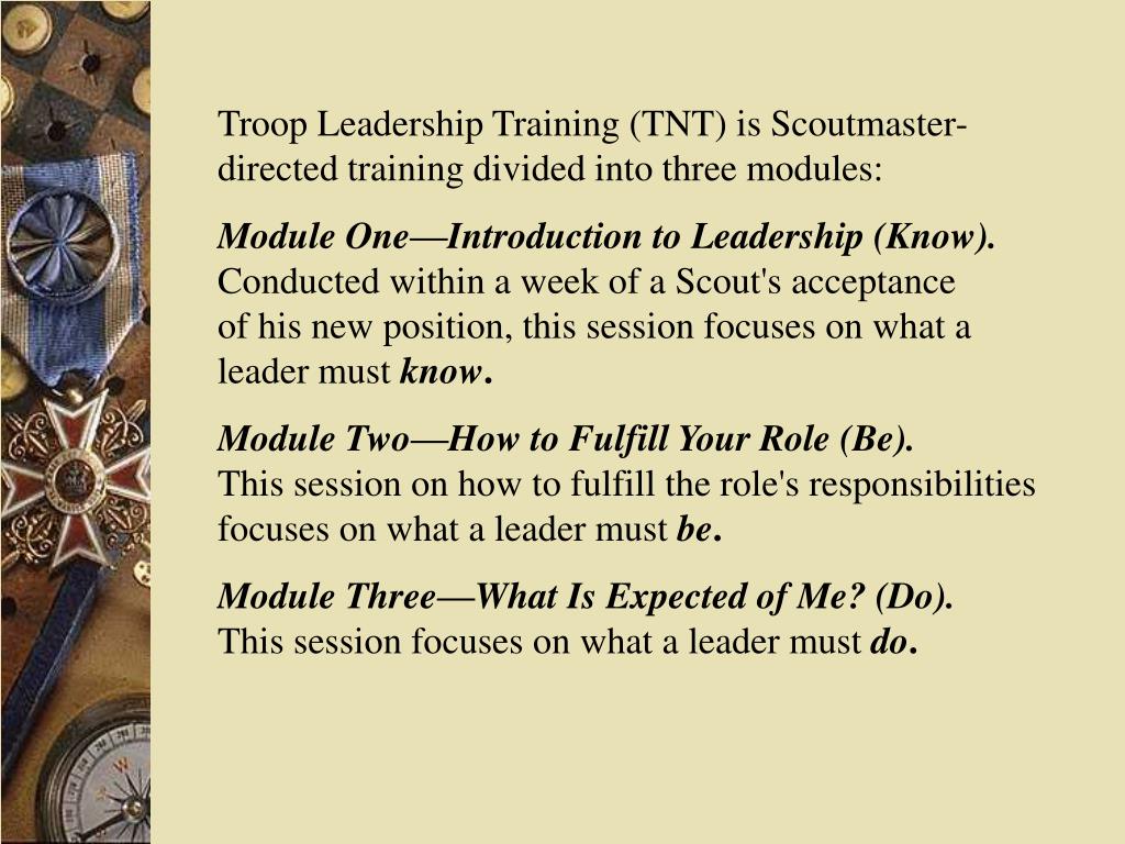 Troop Leadership Training (TNT) is Scoutmaster-directed training divided into three modules: Module One—Introduction to Leadership (Know). Conducted within a week of a Scout's acceptance of his new position, this session focuses on what a leader must know. Module Two—How to Fulfill Your Role (Be). This session on how to fulfill the role's responsibilities focuses on what a leader must be. Module Three—What Is Expected of Me? (Do). This session focuses on what a leader must do.