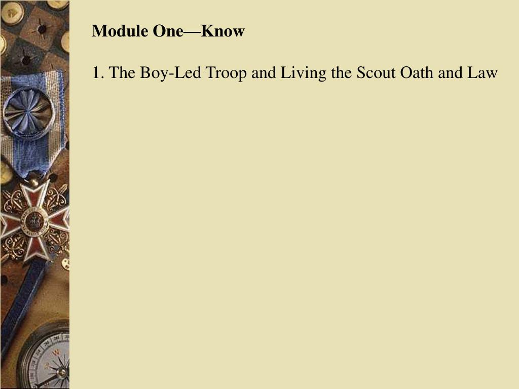 Module One—Know • The Boy-Led Troop and Living the Scout Oath and Law • Discussion of a Boy-Led Patrol • Review of the Troop Organization Chart
