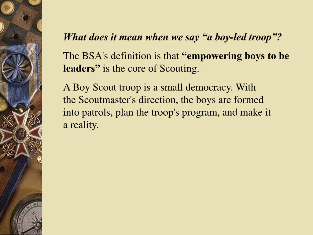 What does it mean when we say “a boy-led troop”? The BSA's definition is that “empowering boys to be leaders” is the core of Scouting. A Boy Scout troop is a small democracy. With the Scoutmaster's direction, the boys are formed into patrols, plan the troop's program, and make it a reality.