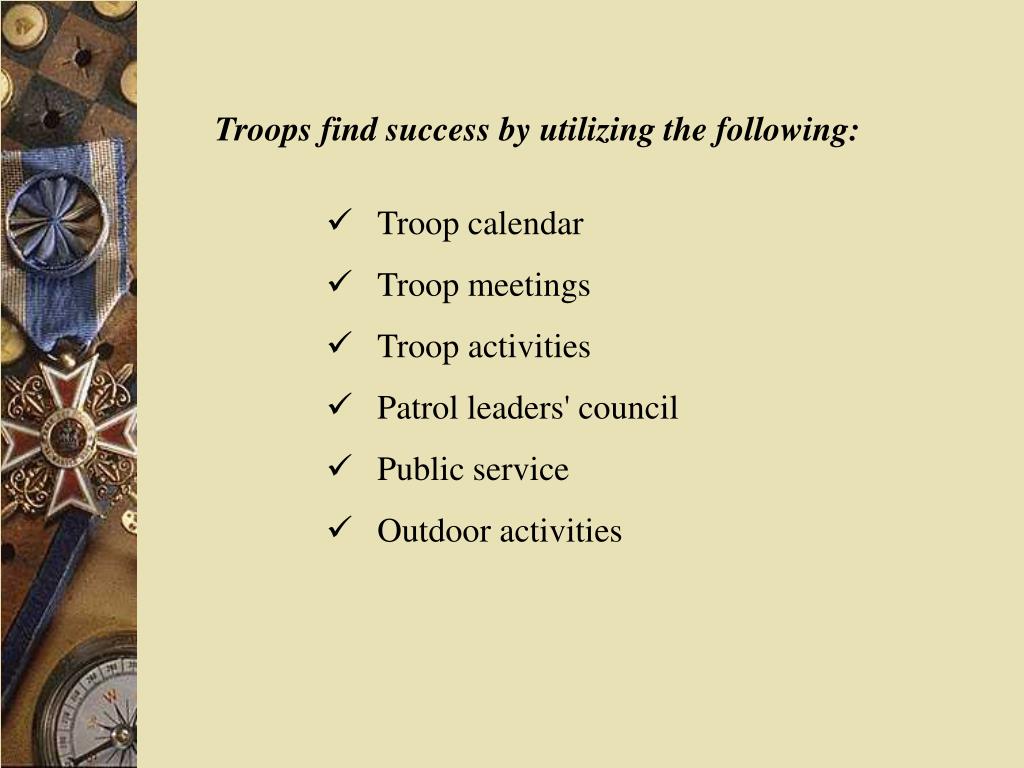 Troops find success by utilizing the following: • Troop calendar • Troop meetings • Troop activities • Patrol leaders' council • Public service • Outdoor activities
