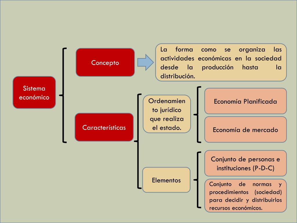La forma como se organiza las actividades económicas en la sociedad desde la producción hasta la distribución. Concepto Sistema económico Economía Planificada Ordenamiento jurídico que realiza el estado. Características Economía de mercado Conjunto de personas e instituciones (P-D-C) Elementos Conjunto de normas y procedimientos (sociedad) para decidir y distribuirlos recursos económicos.