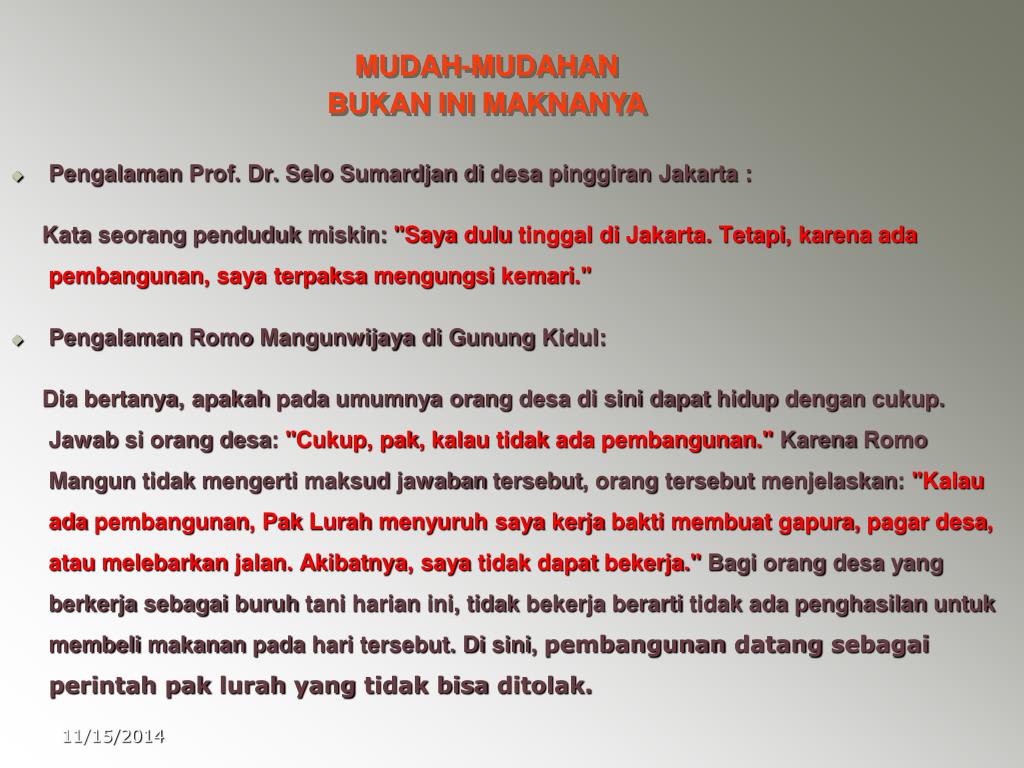 MUDAH-MUDAHAN BUKAN INI MAKNANYA • Pengalaman Prof. Dr. SeloSumardjandidesapinggiran Jakarta : Kataseorangpendudukmiskin: "Sayadulutinggaldi Jakarta. Tetapi, karenaadapembangunan, sayaterpaksamengungsikemari." • PengalamanRomoMangunwijayadiGunungKidul: Diabertanya, apakahpadaumumnyaorangdesadisinidapathidupdengancukup. Jawabsiorangdesa: "Cukup, pak, kalautidakadapembangunan."KarenaRomoManguntidakmengertimaksudjawabantersebut, orangtersebutmenjelaskan: "Kalauadapembangunan, Pak Lurahmenyuruhsayakerjabaktimembuatgapura, pagardesa, ataumelebarkanjalan. Akibatnya, sayatidakdapatbekerja."Bagiorangdesa yang berkerjasebagaiburuhtaniharianini, tidakbekerjaberartitidakadapenghasilanuntukmembelimakananpadaharitersebut. Di sini, pembangunandatangsebagaiperintahpaklurah yang tidakbisaditolak.