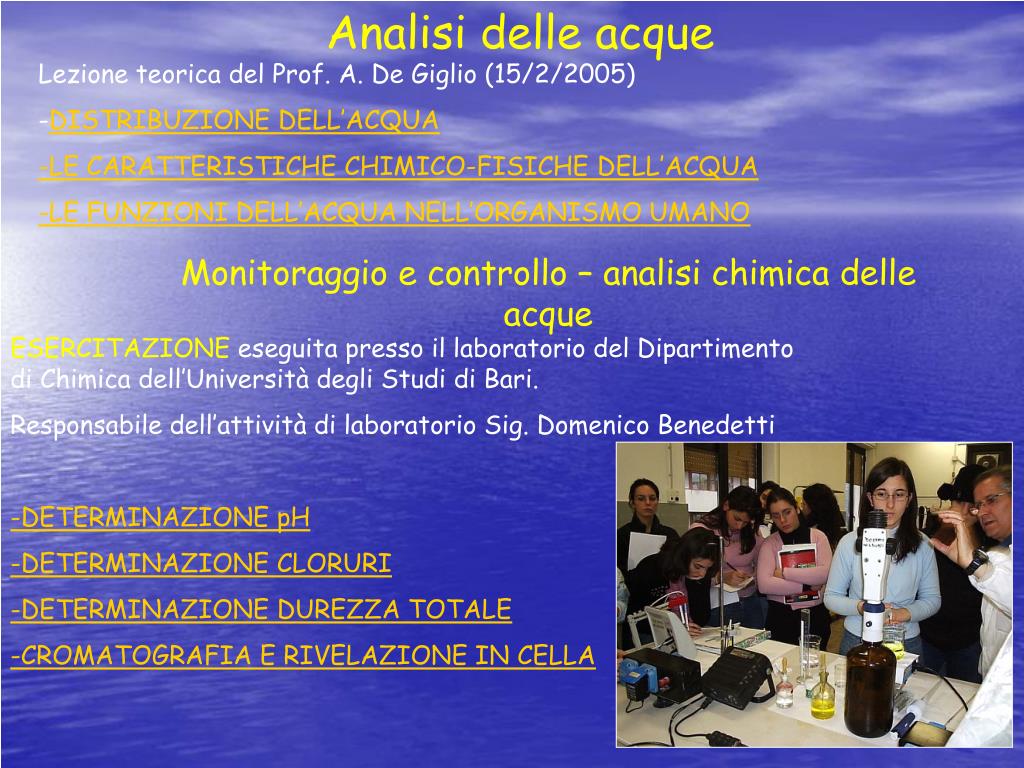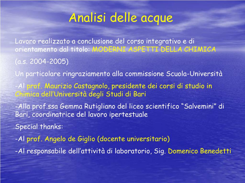 Analisi delle acque Lavoro realizzato a conclusione del corso integrativo e di orientamento dal titolo: MODERNI ASPETTI DELLA CHIMICA (a.s. 2004-2005) Un particolare ringraziamento alla commissione Scuola-Università -Al prof. Maurizio Castagnolo, presidente dei corsi di studio in Chimica dell’Università degli Studi di Bari -Alla prof.ssa Gemma Rutigliano del liceo scientifico “Salvemini” di Bari, coordinatrice del lavoro ipertestuale Special thanks: -Al prof. Angelo de Giglio (docente universitario) -Al responsabile dell’attività di laboratorio, Sig. Domenico Benedetti