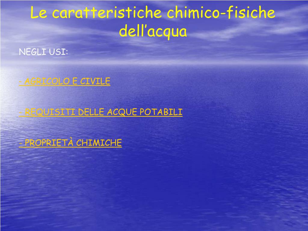 Le caratteristiche chimico-fisiche dell’acqua NEGLI USI: - AGRICOLO E CIVILE - REQUISITI DELLE ACQUE POTABILI - PROPRIETÀ CHIMICHE
