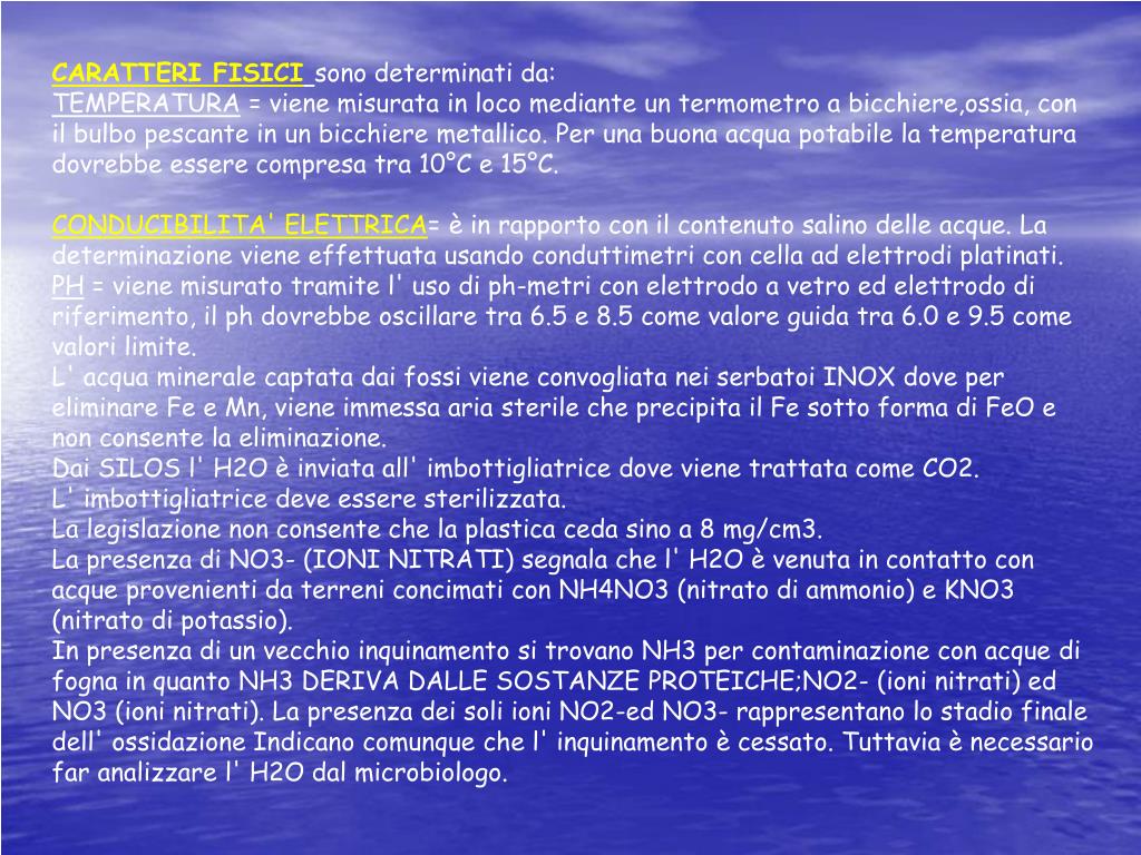 CARATTERI FISICIsono determinati da: TEMPERATURA = viene misurata in loco mediante un termometro a bicchiere,ossia, con il bulbo pescante in un bicchiere metallico. Per una buona acqua potabile la temperatura dovrebbe essere compresa tra 10°C e 15°C. CONDUCIBILITA' ELETTRICA= è in rapporto con il contenuto salino delle acque. La determinazione viene effettuata usando conduttimetri con cella ad elettrodi platinati. PH = viene misurato tramite l' uso di ph-metri con elettrodo a vetro ed elettrodo di riferimento, il ph dovrebbe oscillare tra 6.5 e 8.5 come valore guida tra 6.0 e 9.5 come valori limite. L' acqua minerale captata dai fossi viene convogliata nei serbatoi INOX dove per eliminare Fe e Mn, viene immessa aria sterile che precipita il Fe sotto forma di FeO e non consente la eliminazione. Dai SILOS l' H2O è inviata all' imbottigliatrice dove viene trattata come CO2. L' imbottigliatrice deve essere sterilizzata. La legislazione non consente che la plastica ceda sino a 8 mg/cm3. La presenza di NO3- (IONI NITRATI) segnala che l' H2O è venuta in contatto con acque provenienti da terreni concimati con NH4NO3 (nitrato di ammonio) e KNO3 (nitrato di potassio). In presenza di un vecchio inquinamento si trovano NH3 per contaminazione con acque di fogna in quanto NH3 DERIVA DALLE SOSTANZE PROTEICHE;NO2- (ioni nitrati) ed NO3 (ioni nitrati). La presenza dei soli ioni NO2-ed NO3- rappresentano lo stadio finale dell' ossidazione Indicano comunque che l' inquinamento è cessato. Tuttavia è necessario far analizzare l' H2O dal microbiologo.