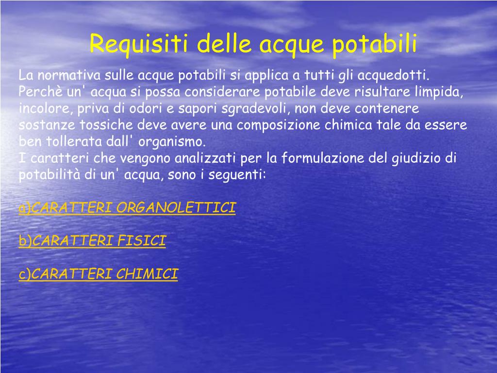 Requisiti delle acque potabili La normativa sulle acque potabili si applica a tutti gli acquedotti. Perchè un' acqua si possa considerare potabile deve risultare limpida, incolore, priva di odori e sapori sgradevoli, non deve contenere sostanze tossiche deve avere una composizione chimica tale da essere ben tollerata dall' organismo. I caratteri che vengono analizzati per la formulazione del giudizio di potabilità di un' acqua, sono i seguenti: a)CARATTERI ORGANOLETTICI b)CARATTERI FISICI c)CARATTERI CHIMICI