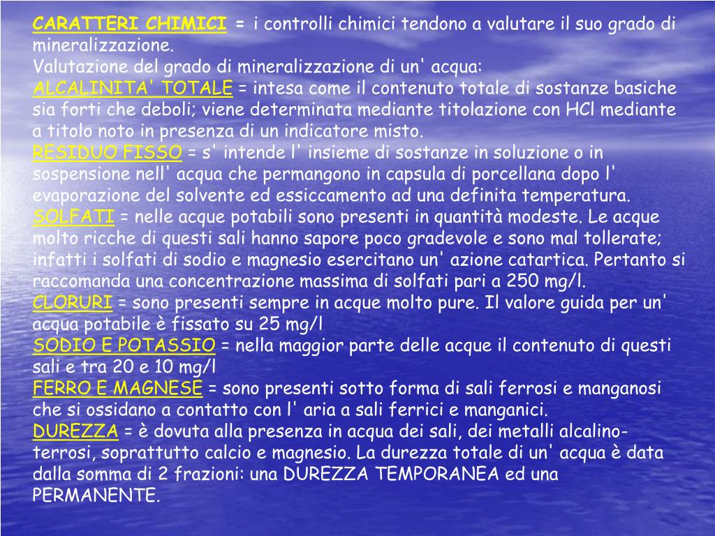CARATTERI CHIMICI = i controlli chimici tendono a valutare il suo grado di mineralizzazione. Valutazione del grado di mineralizzazione di un' acqua: ALCALINITA' TOTALE= intesa come il contenuto totale di sostanze basiche sia forti che deboli; viene determinata mediante titolazione con HCl mediante a titolo noto in presenza di un indicatore misto. RESIDUO FISSO= s' intende l' insieme di sostanze in soluzione o in sospensione nell' acqua che permangono in capsula di porcellana dopo l' evaporazione del solvente ed essiccamento ad una definita temperatura. SOLFATI= nelle acque potabili sono presenti in quantità modeste. Le acque molto ricche di questi sali hanno sapore poco gradevole e sono mal tollerate; infatti i solfati di sodio e magnesio esercitano un' azione catartica. Pertanto si raccomanda una concentrazione massima di solfati pari a 250 mg/l. CLORURI= sono presenti sempre in acque molto pure. Il valore guida per un' acqua potabile è fissato su 25 mg/l SODIO E POTASSIO= nella maggior parte delle acque il contenuto di questi sali e tra 20 e 10 mg/l FERRO E MAGNESE= sono presenti sotto forma di sali ferrosi e manganosi che si ossidano a contatto con l' aria a sali ferrici e manganici. DUREZZA= è dovuta alla presenza in acqua dei sali, dei metalli alcalino- terrosi, soprattutto calcio e magnesio. La durezza totale di un' acqua è data dalla somma di 2 frazioni: una DUREZZA TEMPORANEA ed una PERMANENTE.