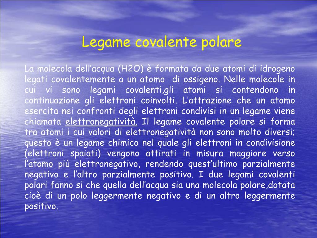 Legame covalente polare La molecola dell’acqua (H2O) è formata da due atomi di idrogeno legati covalentemente a un atomo di ossigeno. Nelle molecole in cui vi sono legami covalenti,gli atomi si contendono in continuazione gli elettroni coinvolti. L’attrazione che un atomo esercita nei confronti degli elettroni condivisi in un legame viene chiamata elettronegatività. Il legame covalente polare si forma tra atomi i cui valori di elettronegatività non sono molto diversi; questo è un legame chimico nel quale gli elettroni in condivisione (elettroni spaiati) vengono attirati in misura maggiore verso l’atomo più elettronegativo, rendendo quest’ultimo parzialmente negativo e l’altro parzialmente positivo. I due legami covalenti polari fanno si che quella dell’acqua sia una molecola polare,dotata cioè di un polo leggermente negativo e di un altro leggermente positivo.