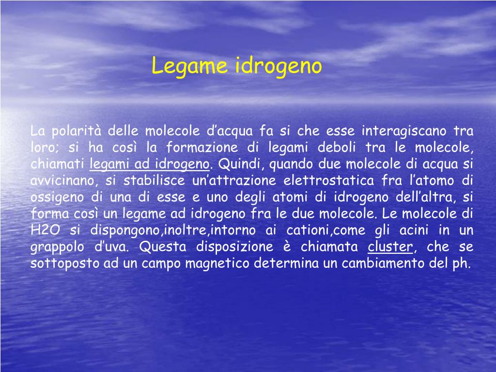 Legame idrogeno La polarità delle molecole d’acqua fa si che esse interagiscano tra loro; si ha così la formazione di legami deboli tra le molecole, chiamati legami ad idrogeno. Quindi, quando due molecole di acqua si avvicinano, si stabilisce un’attrazione elettrostatica fra l’atomo di ossigeno di una di esse e uno degli atomi di idrogeno dell’altra, si forma così un legame ad idrogeno fra le due molecole. Le molecole di H2O si dispongono,inoltre,intorno ai cationi,come gli acini in un grappolo d’uva. Questa disposizione è chiamata cluster, che se sottoposto ad un campo magnetico determina un cambiamento del ph.