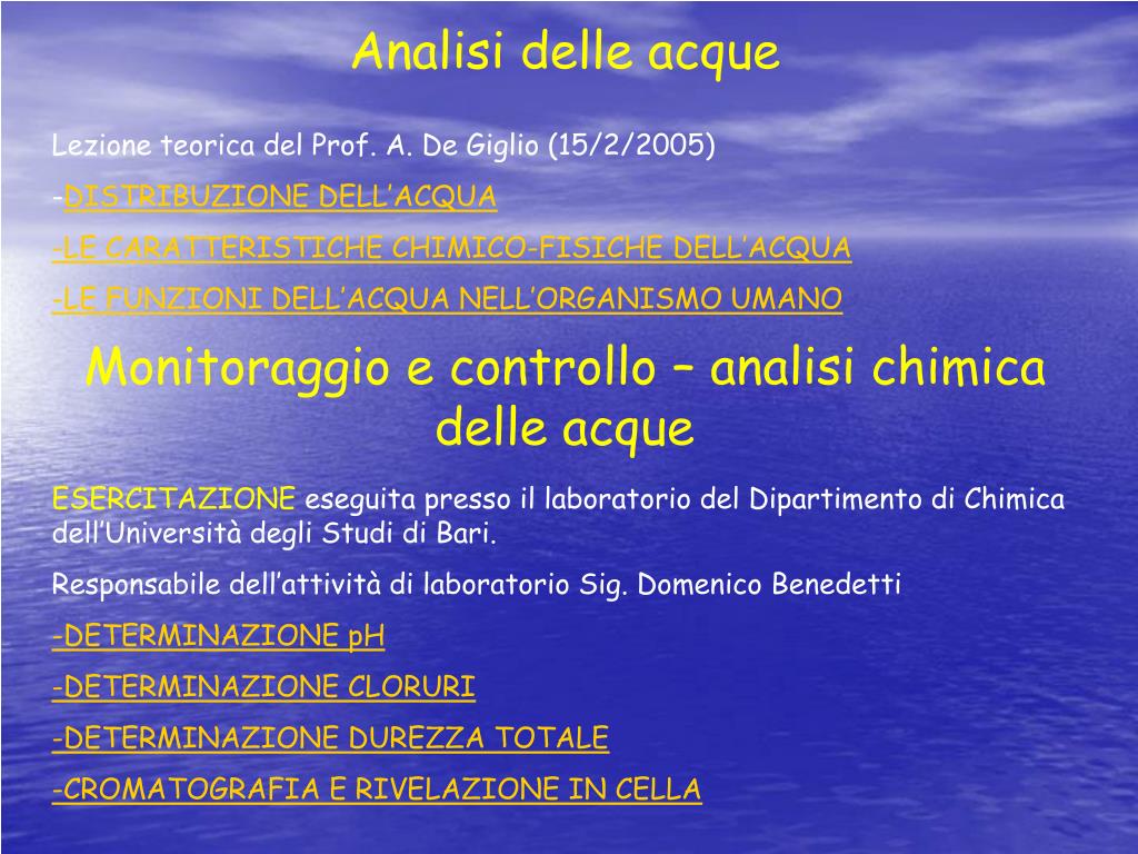 Analisi delle acque Lezione teorica del Prof. A. De Giglio (15/2/2005) -DISTRIBUZIONE DELL’ACQUA -LE CARATTERISTICHE CHIMICO-FISICHE DELL’ACQUA -LE FUNZIONI DELL’ACQUA NELL’ORGANISMO UMANO Monitoraggio e controllo – analisi chimica delle acque ESERCITAZIONE eseguita presso il laboratorio del Dipartimento di Chimica dell’Università degli Studi di Bari. Responsabile dell’attività di laboratorio Sig. Domenico Benedetti -DETERMINAZIONE pH -DETERMINAZIONE CLORURI -DETERMINAZIONE DUREZZA TOTALE -CROMATOGRAFIA E RIVELAZIONE IN CELLA